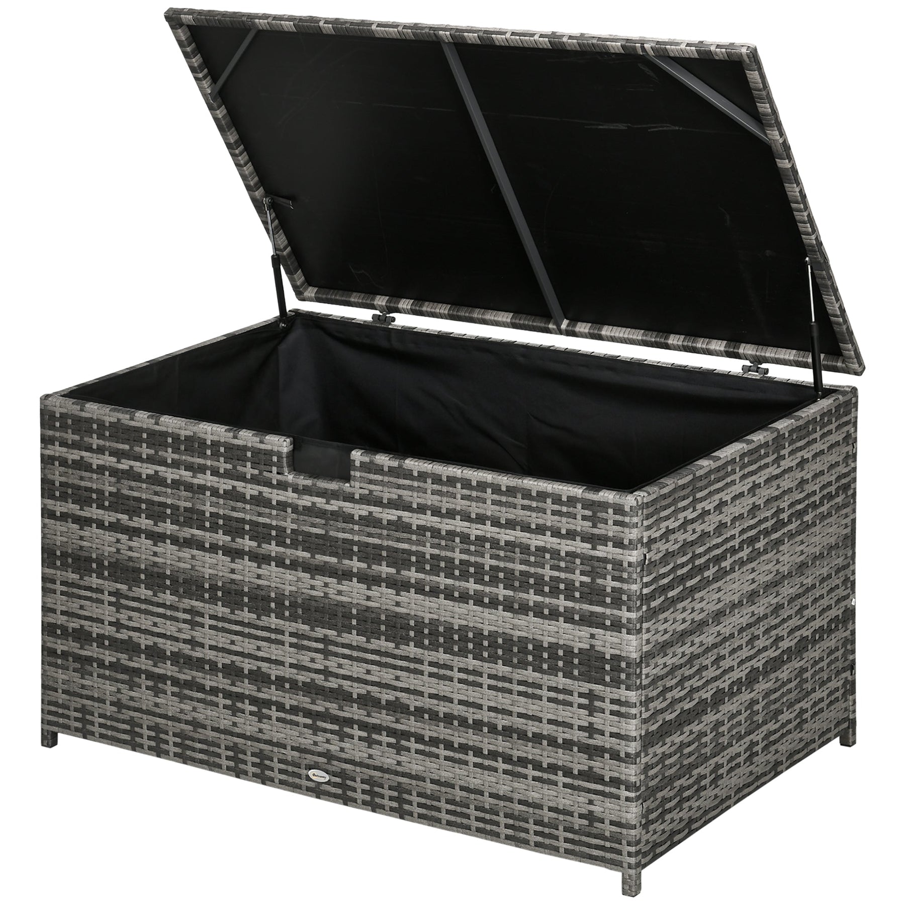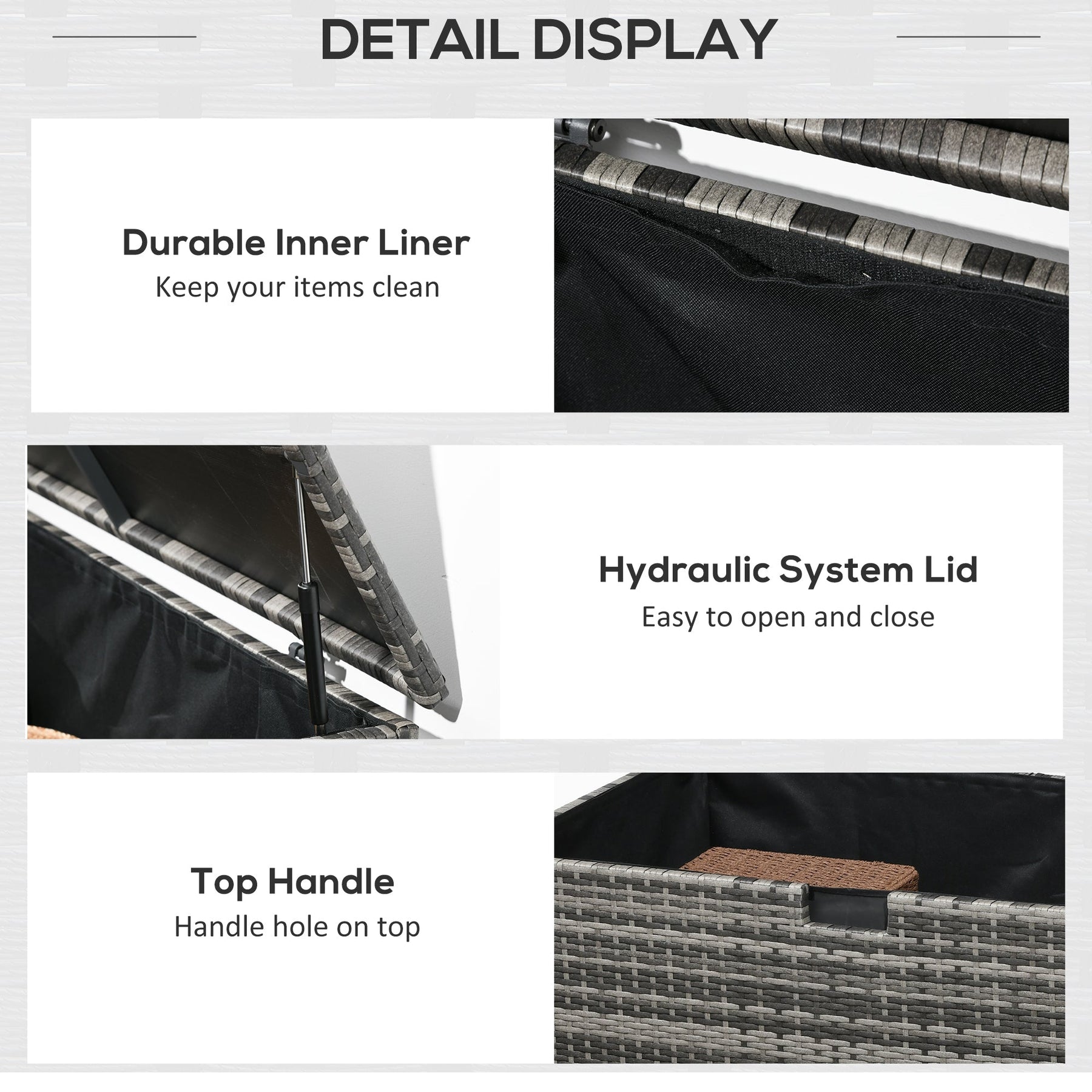 Keep your outdoor space neat and organized with this 113-gallon patio storage box, designed to store everything from pool supplies and garden tools to seasonal clothing and more. Whether placed indoors or outdoors, this storage box offers both functionality and style. Featuring a powder-coated steel frame wrapped in hand-woven PE rattan, it is built to withstand outdoor elements, ensuring long-lasting durability. The hydraulic gas spring-assisted lift system allows for smooth, effortless opening and closing, while the front groove handle provides easy access. A waterproof liner keeps moisture out, effectively protecting stored items from rain and humidity. With a high weight capacity and a spacious interior, this deck storage box is a perfect addition to your patio, balcony, or backyard.