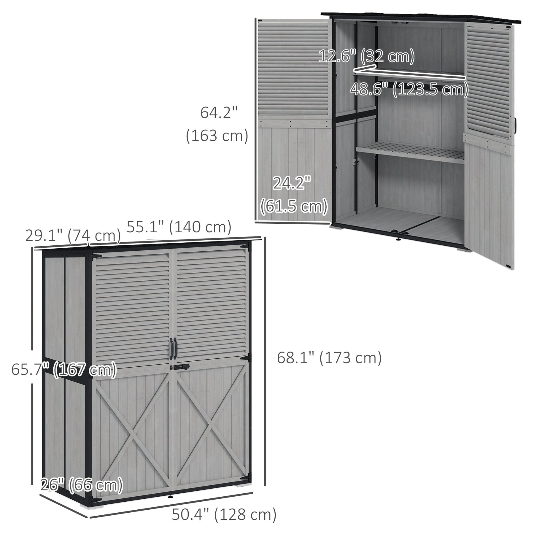 Outsunny Outdoor Storage Cabinet, Wood Garden Shed with Steel Frame, Asphalt Roof, 2 Shelves and Lockable Doors, Grey