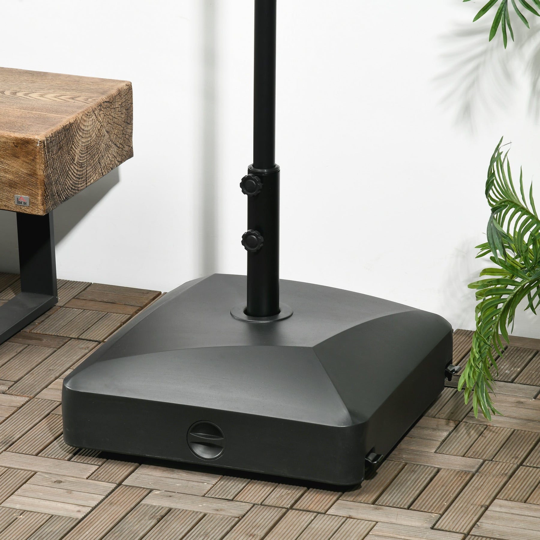 Secure and stabilize your outdoor umbrella effortlessly with this heavy-duty rolling umbrella base. Designed to fit parasol poles with diameters of 1.5" (3.8 cm) and 1.9" (4.8 cm), this base includes two adjustable knobs to keep the pole securely in place. The fillable design allows you to add water, sand, or a combination of both for maximum stability—up to 132 lbs (60 kg) when fully filled. Its convenient side fill port makes both filling and cleaning hassle-free. Equipped with four smooth-rolling wheels, including two lockable brakes, this umbrella base offers excellent mobility while staying firmly in place when needed. Built with PE plastic and a powder-coated metal support tube, it resists chipping, peeling, and weather damage, making it ideal for all outdoor conditions. Compatible with large patio umbrellas, including suggested Outsunny umbrella models (Parent SKU: X-84D-031).