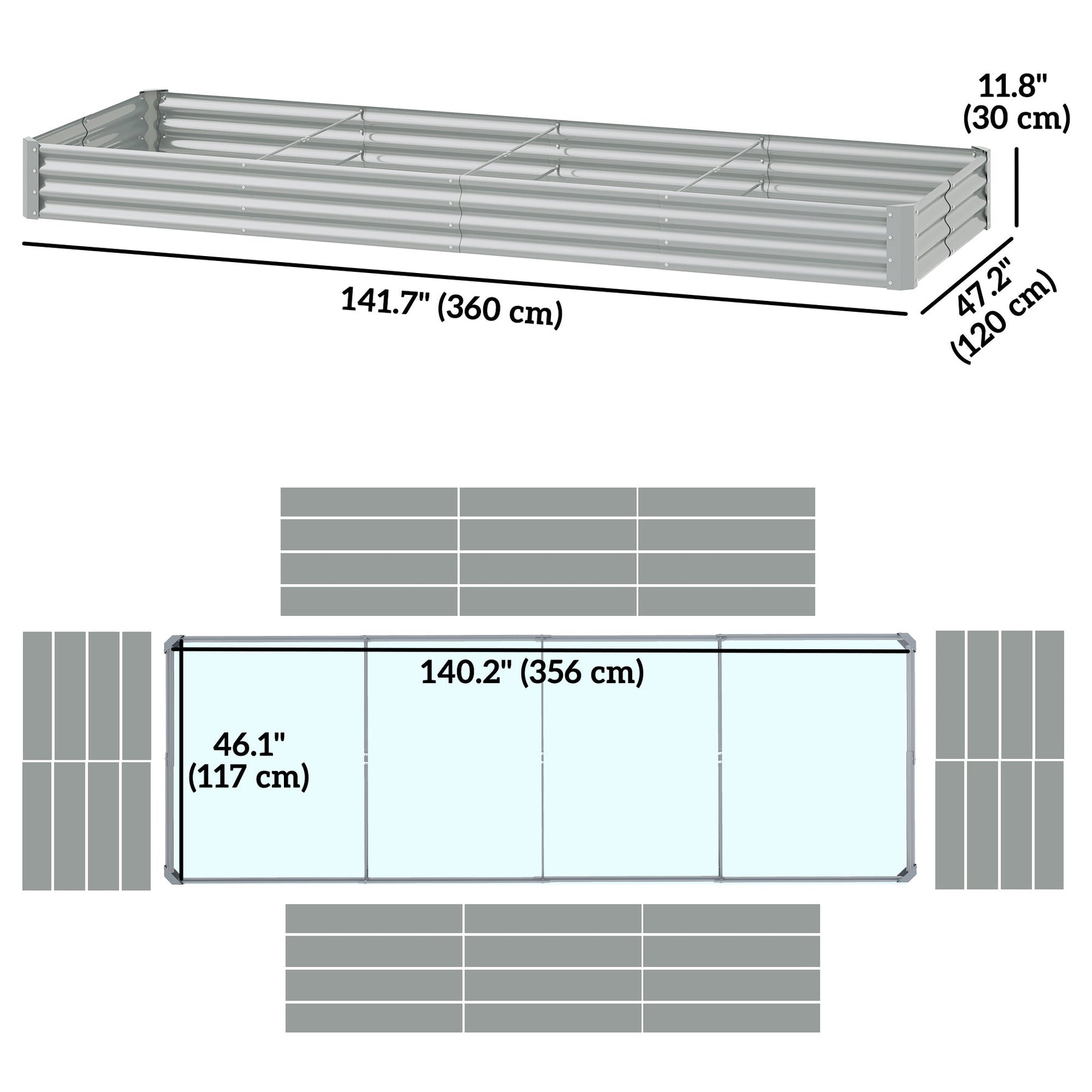 This spacious galvanized raised garden bed provides ample growing space for vegetables, root plants, flowers, and more. Measuring 11.8 x 3.9 x 1 ft, it holds up to 330.5 gallons (1251.5 liters) of soil, offering a deep growing depth of 1 ft (30 cm). Built with a durable powder-coated galvanized steel frame, it excels in rust and weather resistance, making it perfect for year-round outdoor use. The bed is reinforced with inner support bars and thick corner sheets to prevent cracks and soil leakage, ensuring long-lasting stability. The open bottom design encourages healthy root growth by providing excellent drainage and preventing water-logging. This metal planter is an ideal choice for cultivating plants in any garden while promoting optimal moisture levels for plant health.