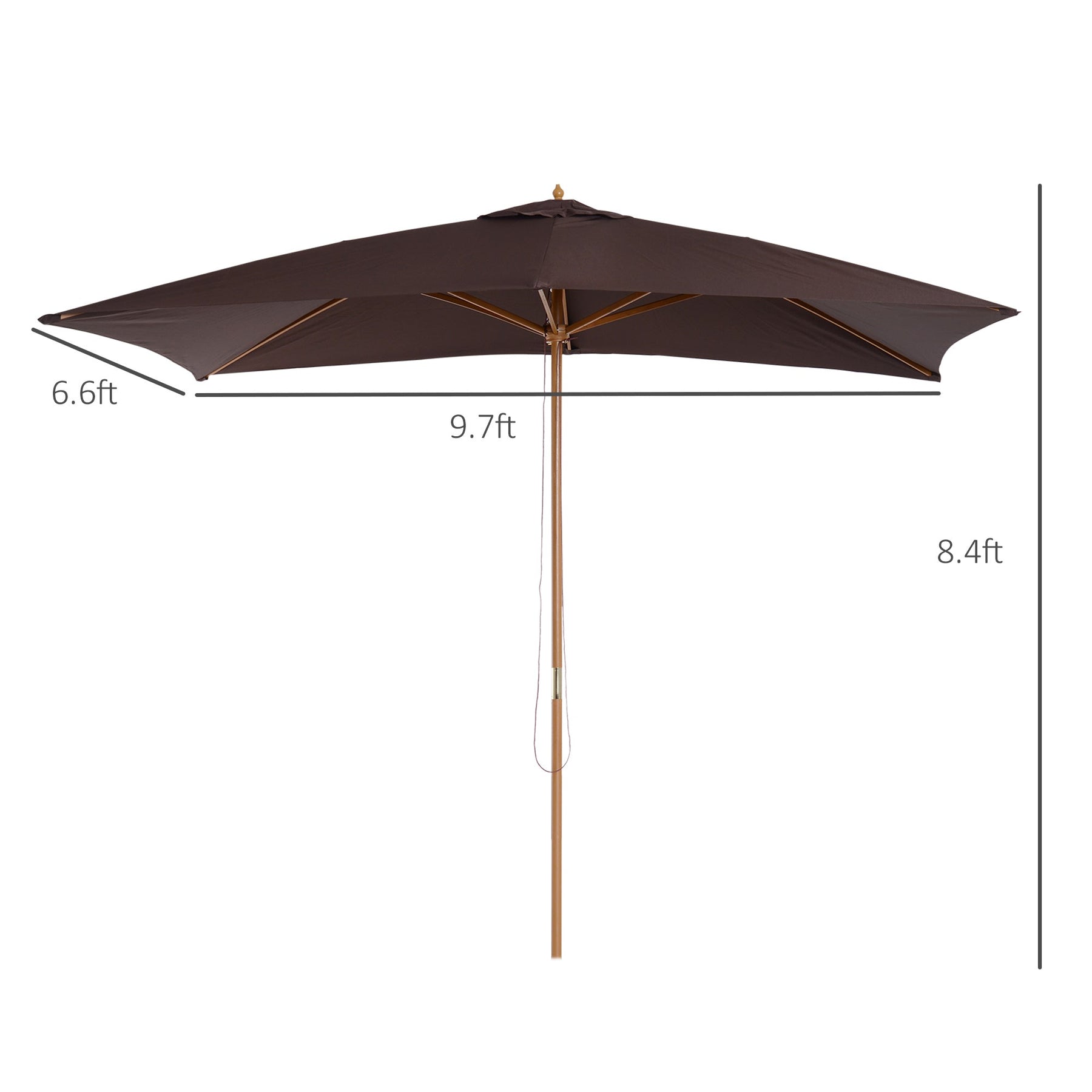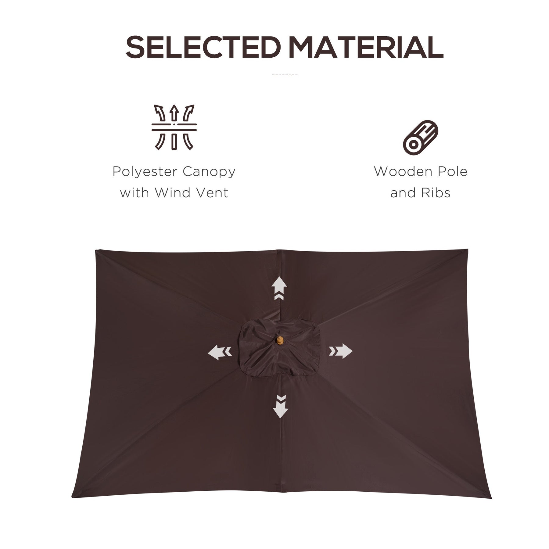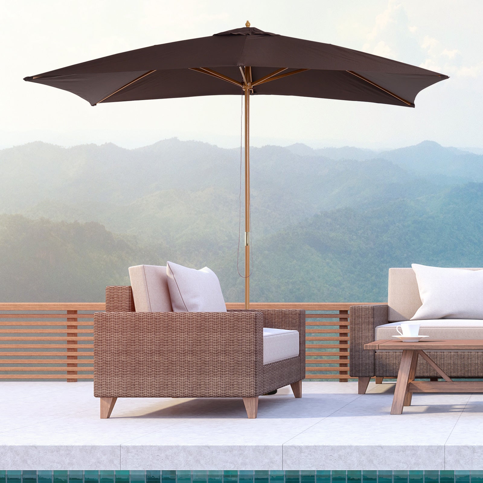 Relax outdoors with ease under the shade of this high-quality rectangular patio umbrella, designed to provide protection from the sun during hot summer days. Crafted with 180g/㎡ UV-protected polyester cloth, this umbrella ensures durability and excellent sun resistance, allowing you to enjoy your outdoor space without worrying about harmful UV rays. The umbrella features six bamboo ribs, which offer superior resilience and flexibility compared to steel ribs, making it less likely to break under stress. A practical top vent is included to effectively reduce wind stress, keeping the umbrella stable and preventing it from blowing over on breezy days. The easy set-up process involves simply screwing the two umbrella pole sections together and using the double pulley system to open the canopy smoothly. The canopy can be adjusted to four different positions with a latch for added versatility. With its elegant design and reliable functionality, this umbrella is ideal for poolside, patio, or garden use. Stand is excluded.