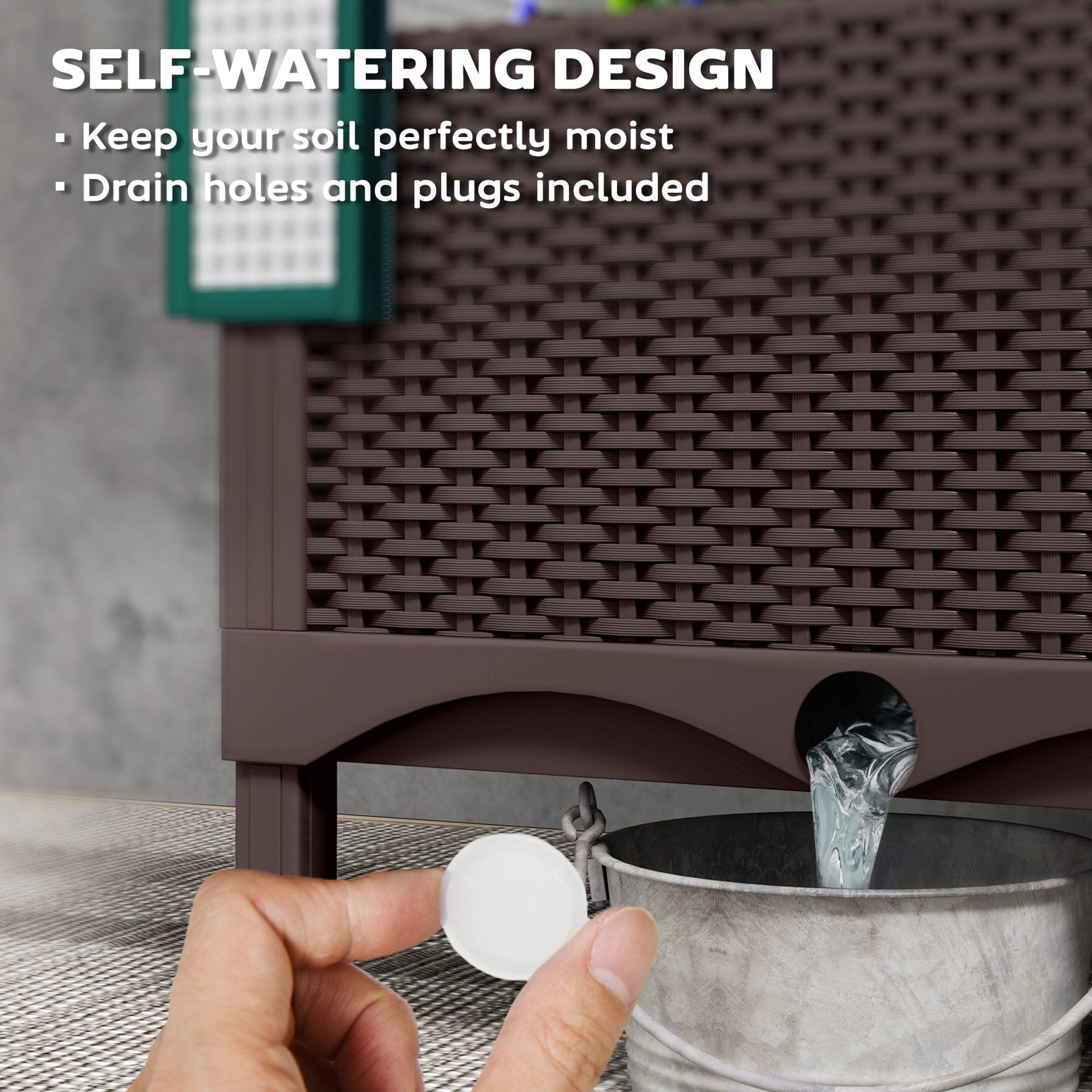 • Self-Watering System: Built-in watering system ensures consistent hydration with efficient water management via drainage holes and drain plugs.