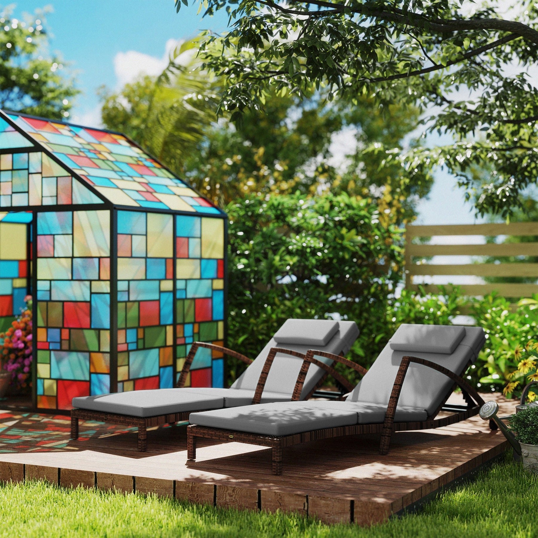 Set of Two Patio Loungers: Relax and unwind in style with this set of two outdoor loungers. The unique S-shaped design offers exceptional comfort by contouring to your body, making it perfect for sunbathing, chatting, reading, or just enjoying a drink by the pool after a swim. Whether you're sitting up, reclining, or lying flat, these loungers have a five-position adjustable backrest that lets you find your perfect position. The convenient wheels make it easy to move and position your loungers anywhere you want to soak up the sun.Enhanced Comfort: Each lounger is equipped with built-in armrests, an integrated cushion, and a head pillow for superior comfort. The splash-resistant zipper covers are easy to clean, and the straps keep the cushions securely in place. You'll have everything you need for a relaxing day outdoors.Robust and Durable Build: Constructed from hand-woven PE rattan wicker and a galvanized steel frame, these loungers are designed to withstand the elements and offer long-lasting durability. The protective foot pads help preserve surfaces, ensuring your loungers remain in great condition for seasons to come.