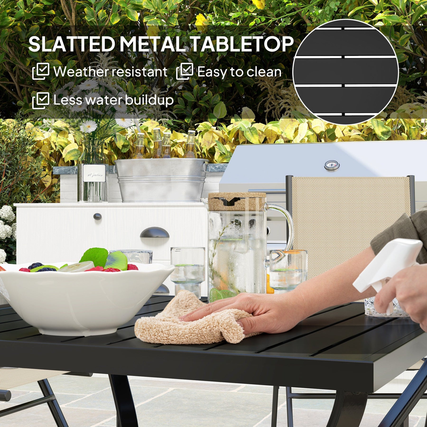 Slatted metal tabletop design allows water drainage, preventing build-up and adding an elegant touch.