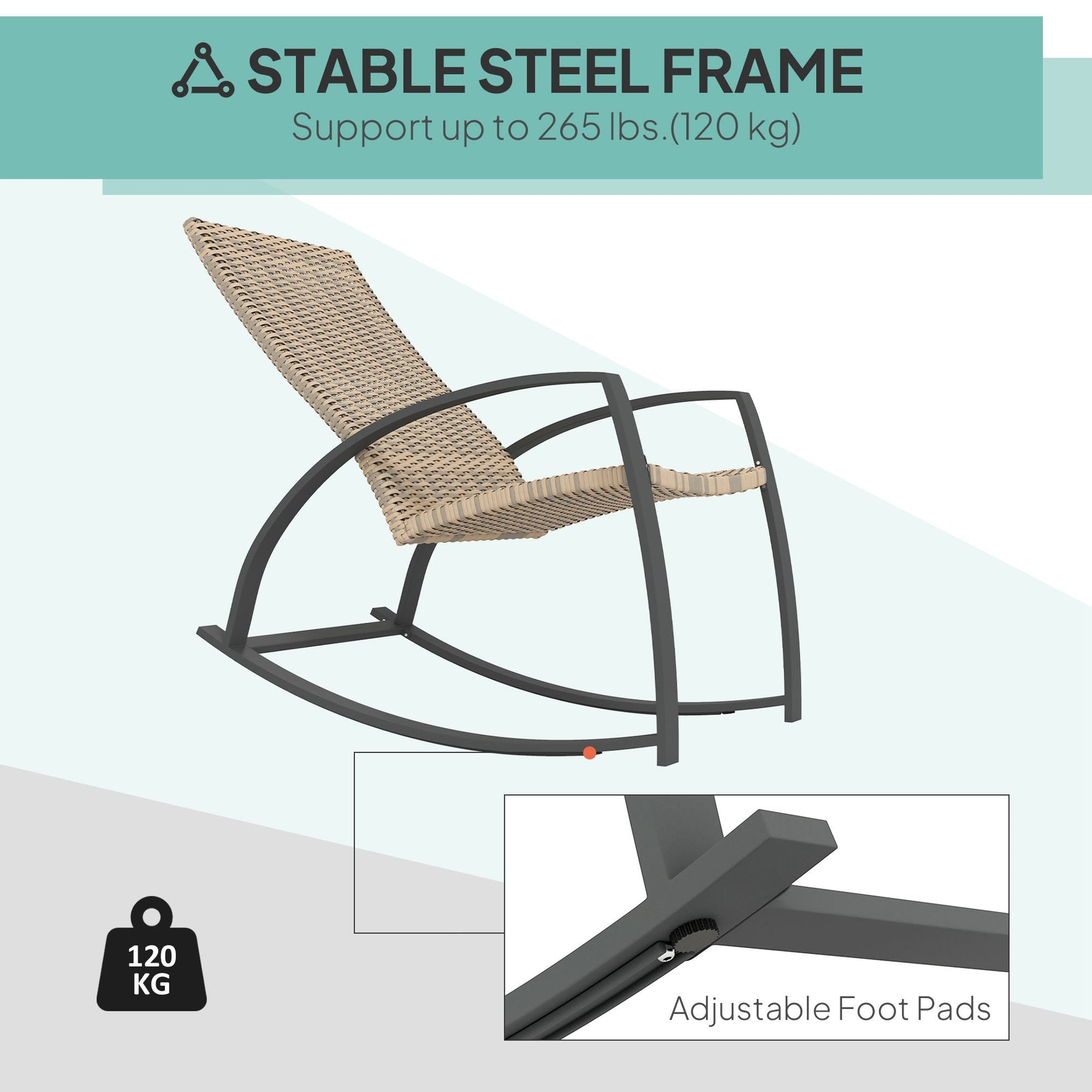 Relax in comfort with this Set of 2 Rocking Chairs, perfect for unwinding on your garden, deck, porch, or even indoors. Designed for ultimate relaxation, each chair features a high backrest that supports your body while providing ergonomic armrests for added comfort. The rocking motion is smooth and gentle, creating a soothing experience. Crafted with UV-resistant, easy-to-clean PE wicker, these chairs are designed to withstand outdoor conditions, including light water exposure. Built on a strong powder-coated steel frame, these rocking chairs offer robust support and come equipped with adjustable non-slip foot pads to ensure a stable and smooth rocking experience on any surface. With a weight capacity of 265 lbs per chair, this set combines style, comfort, and durability, making it a great addition to your outdoor seating collection.