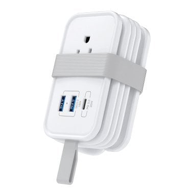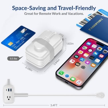 The Uncaged Ergonomics® Portable Travel Power Strip in white is the ultimate compact charging solution for all your devices. With 3 AC outlets, 2 USB-A ports, and 1 USB-C® 20-Watt fast-charging port, it provides ample power for smartphones, laptops, tablets, and other electronics. The 3-ft cord gives you the flexibility to position the power strip where you need it, whether at home, in the office, or on the go. Lightweight and portable, this power strip is designed for easy packing and travel. Its sleek white finish makes it a versatile and professional addition to any setting.