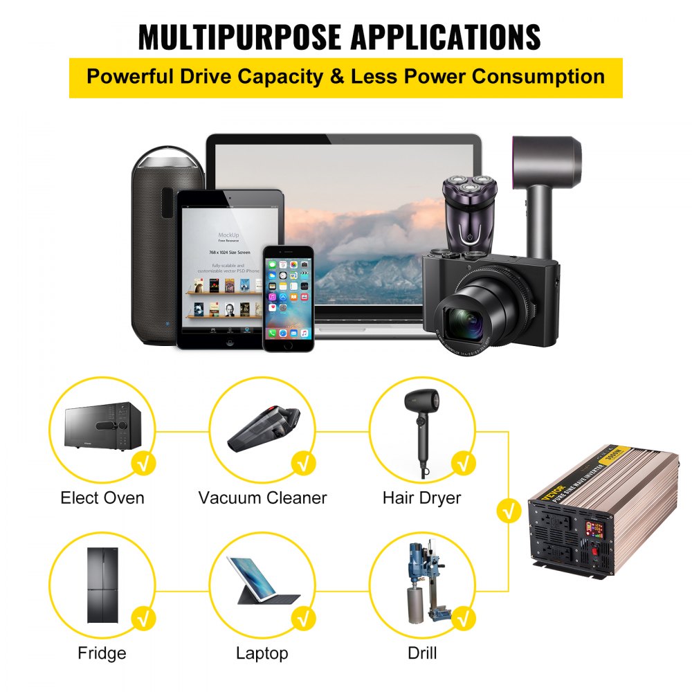 The VEVOR Pure Sine Wave Inverter delivers 3000 watts of clean, stable power—ideal for powering sensitive electronics and appliances in cars, RVs, trucks, and solar systems. This high-performance inverter converts DC 12V to AC 110V and features an intuitive LCD display for real-time monitoring, a 5V USB port for convenient device charging, and GFCI AC outlets for enhanced safety. Whether you're traveling, camping, or living off-grid, this inverter offers reliable, efficient power wherever you go.