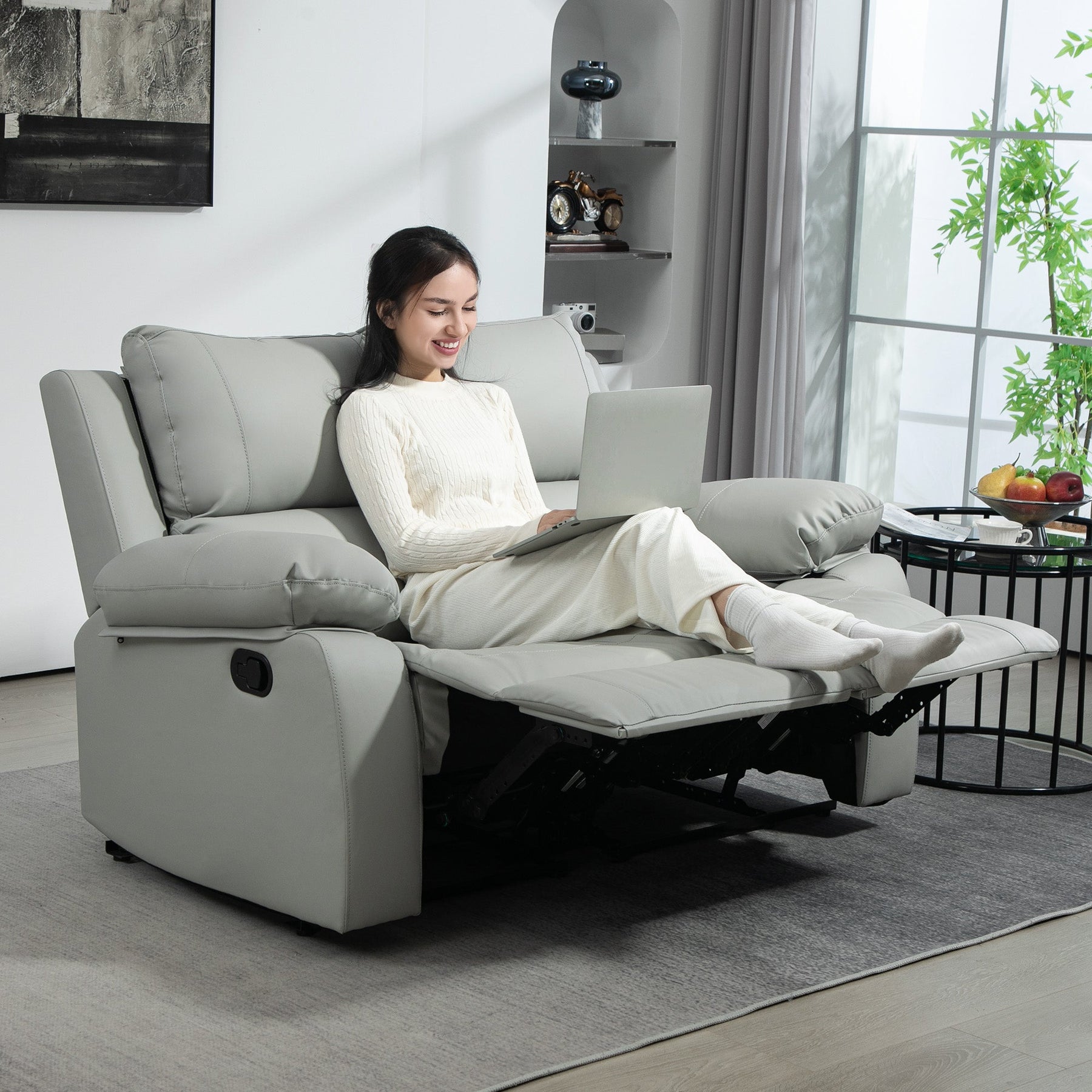 HOMCOM PU Leather Manual Recliner Sofa, Double Reclining Loveseat with Pullback Control Footrest for Living Room, Light Grey