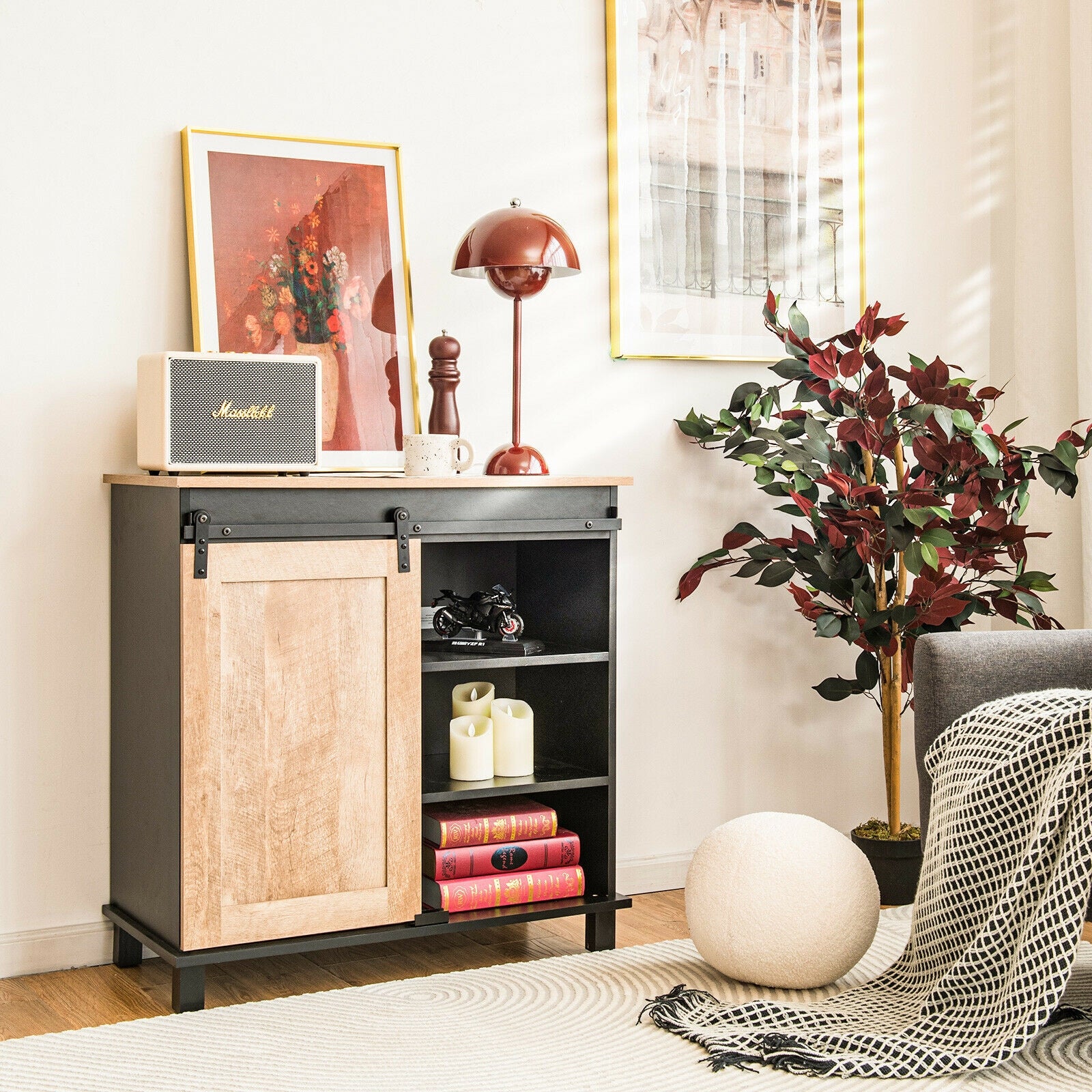 This buffet cabinet is a practical and stylish addition to your home, offering ample storage space and versatility. Designed with a combination of an X-shaped wine rack, 2 drawers, and a 3-tier shelf, it’s perfect for storing bowls, glasses, kitchenware, dinnerware, and more. The wine rack can be installed or removed based on your preference. This cabinet can be used in various spaces, such as your kitchen, dining room, entryway, living room, or bedroom. Featuring a sliding barn door for easy access to your items, this piece combines convenience with an industrial design. It is also equipped with a safety device to prevent tipping over, ensuring long-lasting stability.