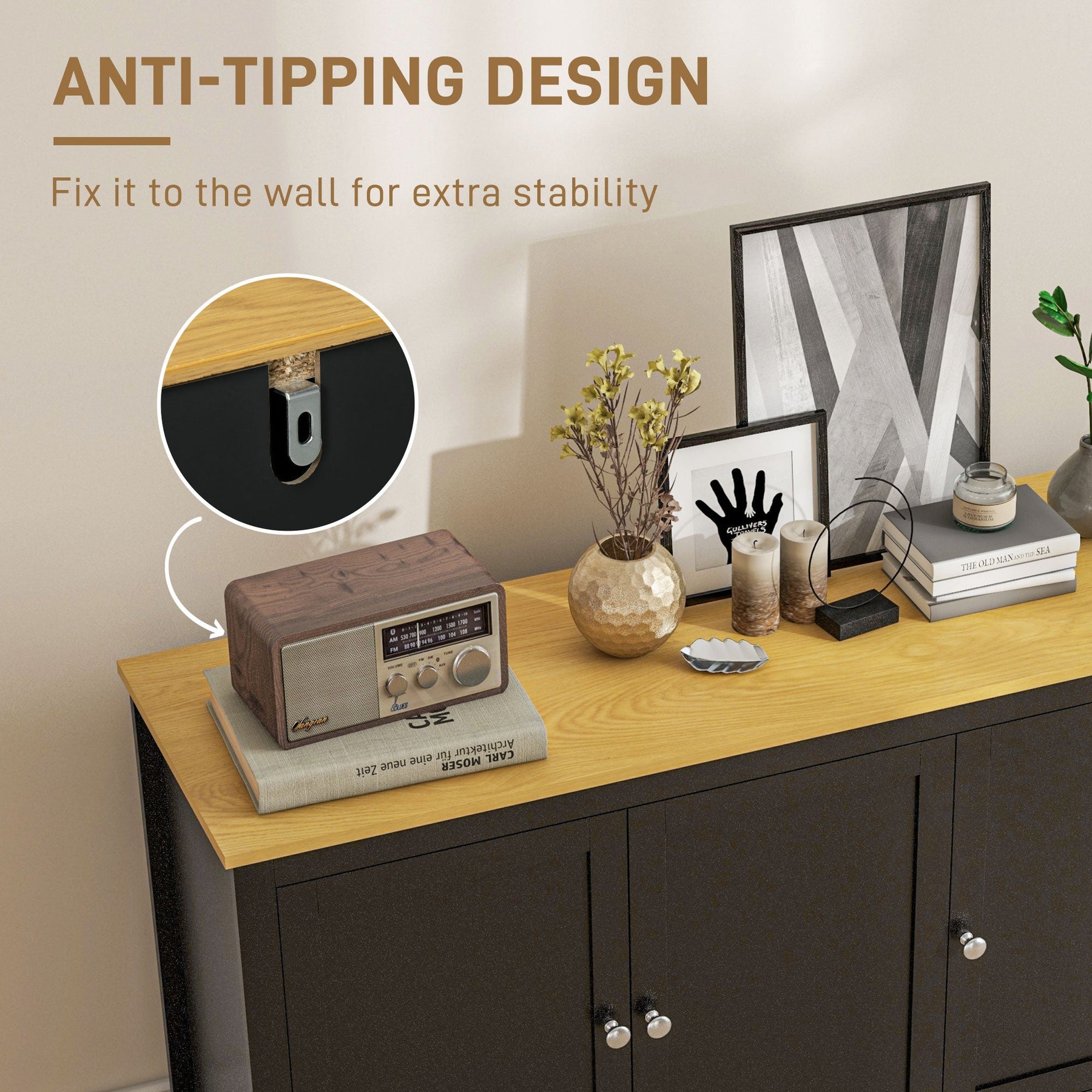 This modern kitchen storage cabinet combines sleek design with practical functionality, making it the perfect addition to any home. Featuring a wood grain color top, shaker doors, and a metal handle, it brings a touch of modern flair to your space. The cabinet offers two enclosed compartments with doors, helping to keep your kitchen, hallway, or living area organized and dust-free. Inside, the shelves are three-level adjustable, giving you the flexibility to store a variety of items, from kitchenware to decorative pieces. Crafted from high-quality MDF and particle board with a painted coated finish, this coffee bar cabinet is durable and easy to clean. Built for safety, it includes an anti-tipping design and anti-slip foot pads to provide extra stability. Whether used as a microwave cabinet, storage unit for collections, or a hallway organizer, this versatile piece brings style and order to any room.