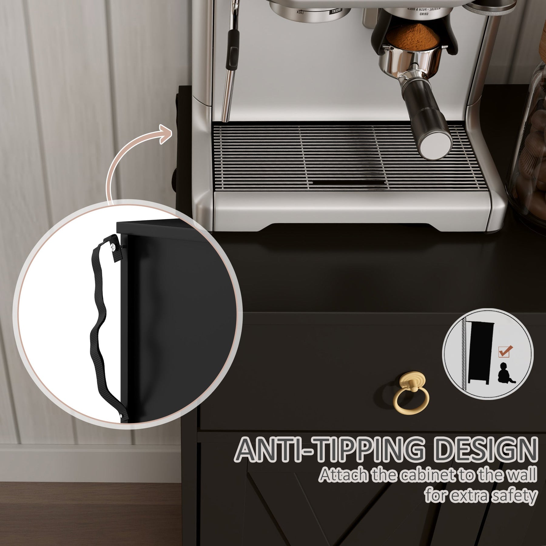 Elevate your home with this stylish and functional farmhouse-inspired kitchen cabinet. The spacious design features two large drawers for utensils and a bar cabinet to keep your kitchen or living room essentials neatly tucked away and dust-free. Customize your storage needs with two adjustable shelves, each offering three positions (spaced 2.4" or 6 cm apart), allowing you to store a variety of items in a way that suits your needs. With a wood-grain tabletop, antique ring knobs, and charming barn-style doors, this storage buffet table adds a rustic touch to your space. Ideal for use as a coffee bar in the living room, a sideboard in the dining area, or a storage unit in the bar area, it enhances both style and organization. Built with a robust solid particleboard frame, the smooth surface is waterproof and easy to clean. For added safety, an anti-tipping design allows you to securely attach the cabinet to the wall.