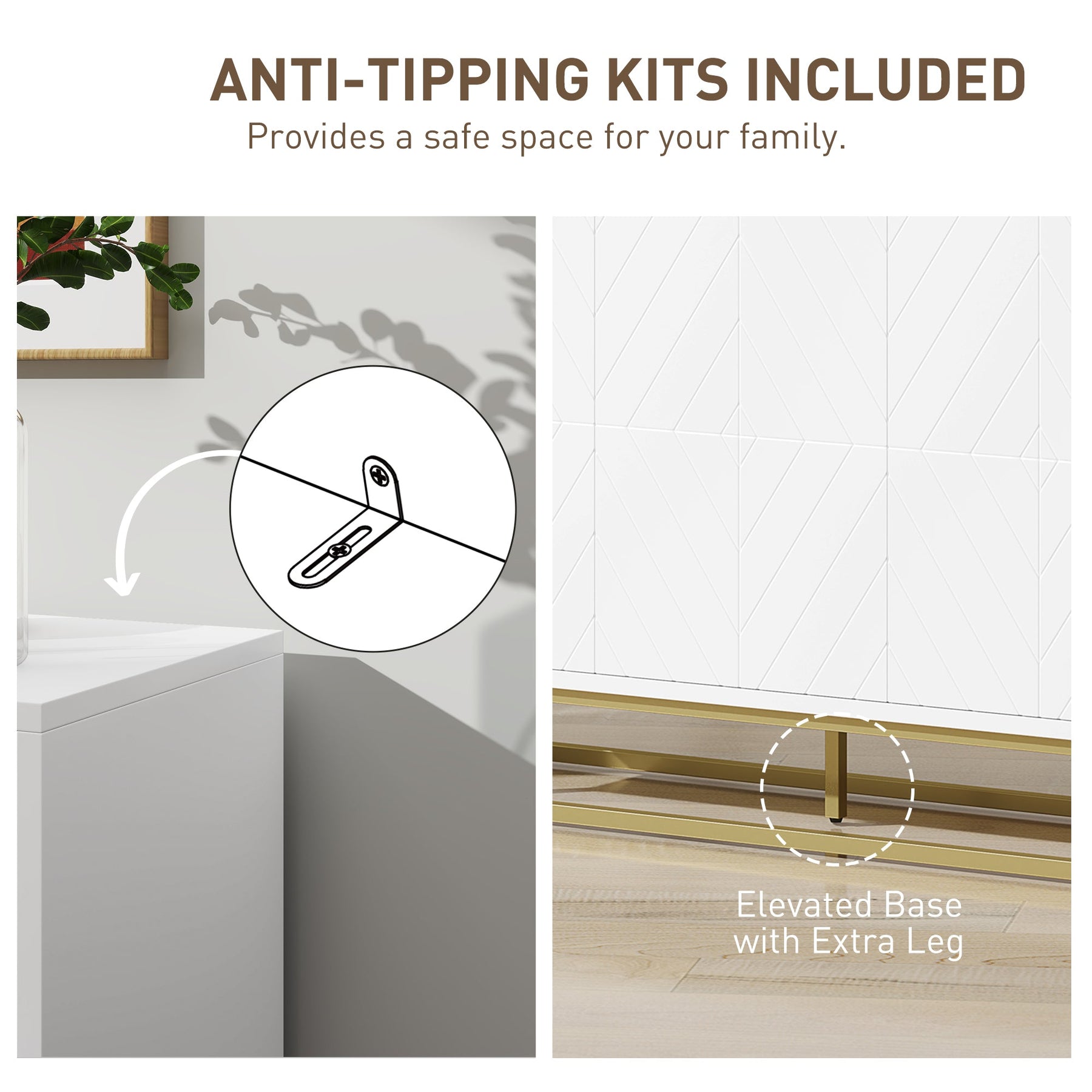 This elegant sideboard is designed to bring a sophisticated touch to any space with its sleek geometric doors and golden accents. Perfect for enhancing your living room, kitchen, or entryway, it combines both style and function. The three-door cabinet offers generous storage space, while the spacious top is ideal for setting up a coffee bar or displaying decorative items. Inside, three adjustable shelves provide customizable storage solutions, making it easy to organize daily essentials. Crafted from durable MDF and metal, this kitchen cabinet is designed for long-term use and easy maintenance. For added safety, the cabinet comes with an anti-tipping kit and an extra leg at the bottom to ensure stability.
