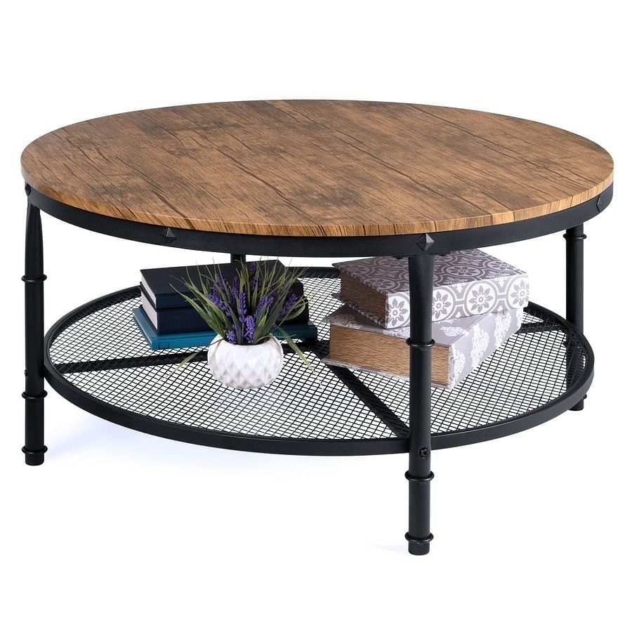 FarmHome Industrial Wood Steel Coffee Table 2-Tier Round with Storage Shelves - Free Shipping