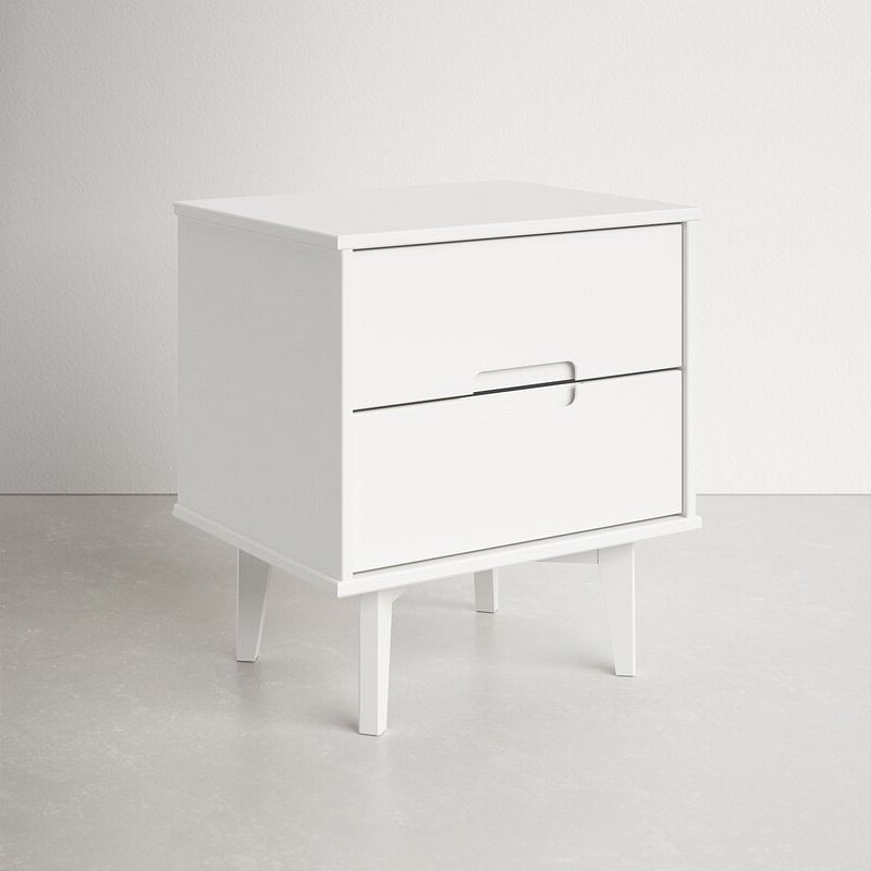 Enhance your bedroom with the FarmHouse 2 Drawer Solid Wood Nightstand, featuring a charming blend of mid-century modern and transitional design elements. The sleek, stained white finish complements any decor, while the angled legs and unique cutout handles add a touch of elegance.