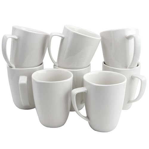 Serve up your favorite beverages in style with the Gibson Simplicity Buffetware Square Mug Set. This set features eight 12 oz. mugs in a sleek, classic white with a unique square shape. Designed with soft angles for a comfortable grip, these mugs offer a modern minimalist look that complements any dining set.