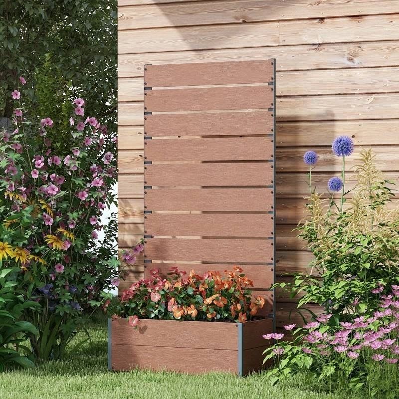 Transform your garden with the Raised Garden Bed Planter featuring a Slatted Fence Trellis in a rich brown wood finish. This versatile planter not only provides ample space for your plants but also includes a slatted trellis that supports climbing plants and vines. The sturdy wood construction and elegant finish make this planter a stylish and practical addition to any outdoor space.