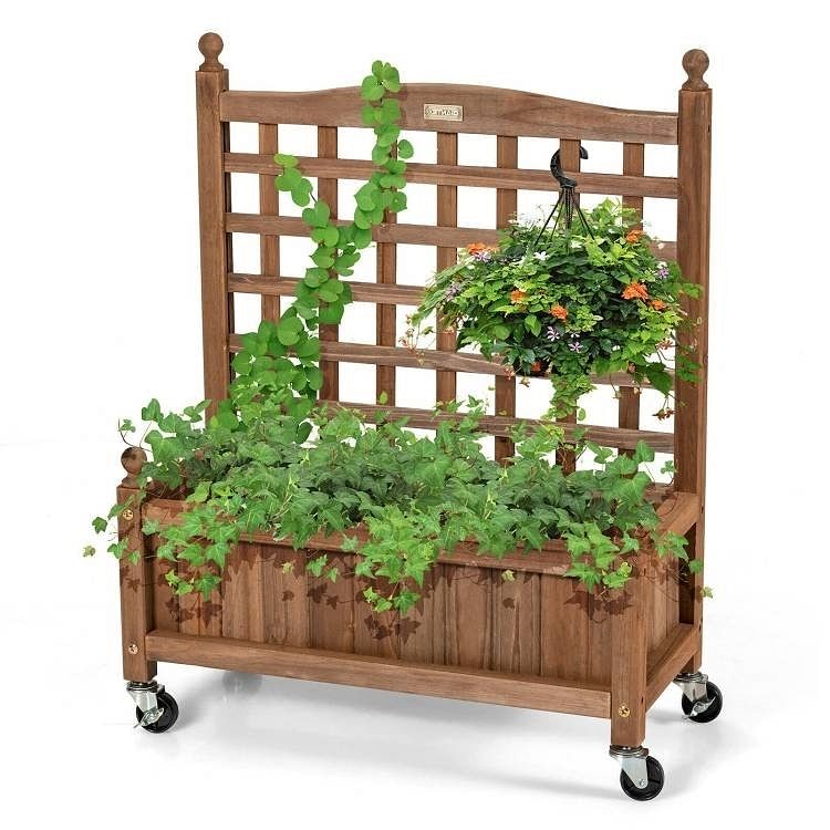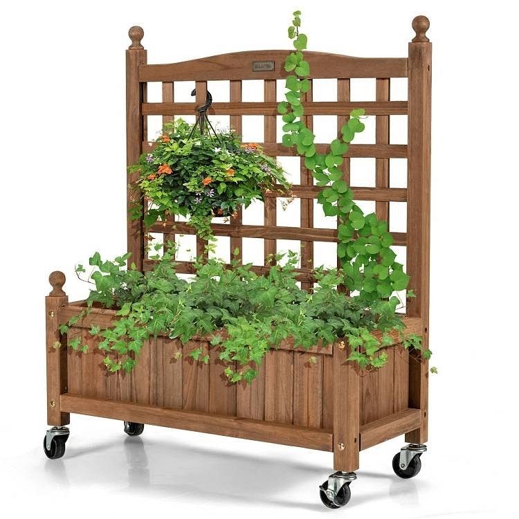 Create your dream garden with the Solid Fir Wood Outdoor Raised Garden Bed Planter Box Cart. This versatile planter features a spacious planting bed and an elegant trellis, making it perfect for a variety of plants, from vegetables and herbs to flowers and climbing plants.