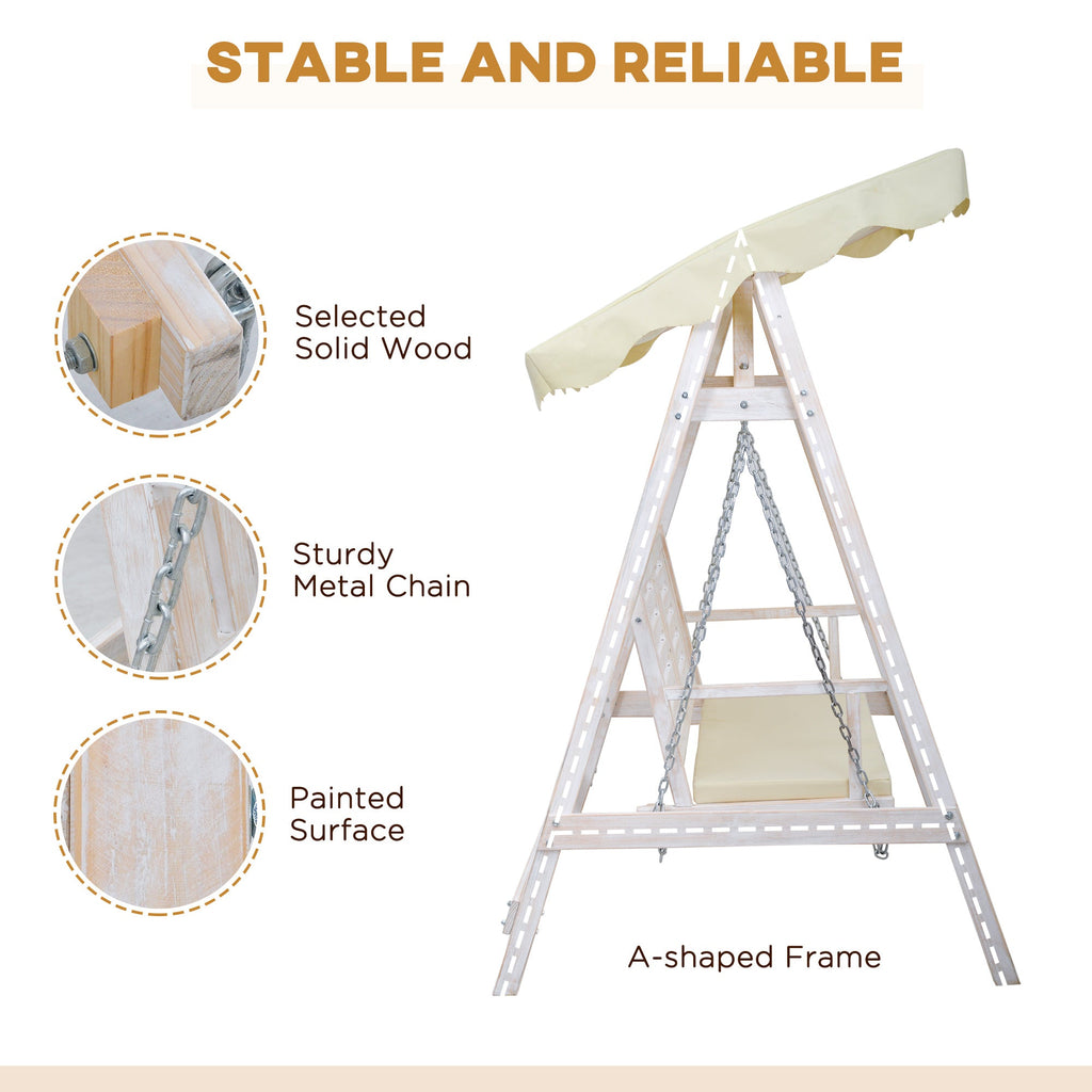 Unwind in style with this elegant two-seater patio swing with canopy—perfect for lounging solo or relaxing with a friend. Its stylish design and solid wood construction make it a charming addition to any backyard, garden, or patio space. The wide, overhead canopy offers reliable shade, helping protect you from harsh sunlight during warm days. For added comfort, this porch swing includes a padded seat cushion, and the removable cushion cover allows for easy cleaning via a convenient zipper closure. Durable powder-coated metal chains support the swing securely, while the sturdy wood frame enhances both style and long-term use. With a generous 440 lb weight capacity and comfortable dimensions, it’s the ideal outdoor seating solution for sunny day comfort.