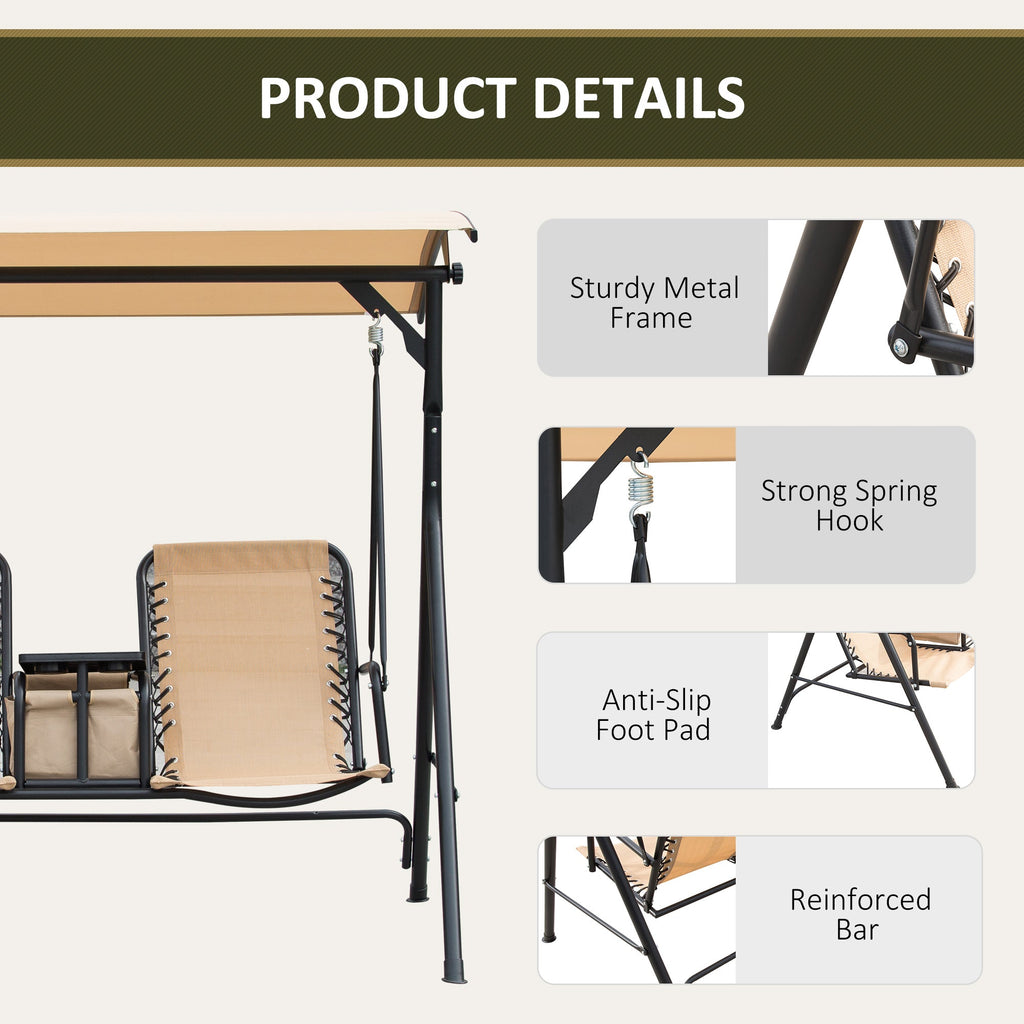 Double the comfort and convenience with this 2-person outdoor swing featuring individual seats and a shared central console. Whether you place it on the patio, deck, lawn, or in your garden, this covered swing lets two people relax and swing together while enjoying the comfort of mesh seats and the protection of an adjustable UV-blocking canopy. The middle console includes two built-in cup holders and a hidden storage compartment—perfect for keeping drinks, books, phones, or other small items close at hand. Built with a powder-coated steel frame and quick-dry mesh fabric, this swing is both sturdy and low-maintenance. Skid-resistant foot pads enhance safety and stability, making it a perfect addition to any outdoor space.