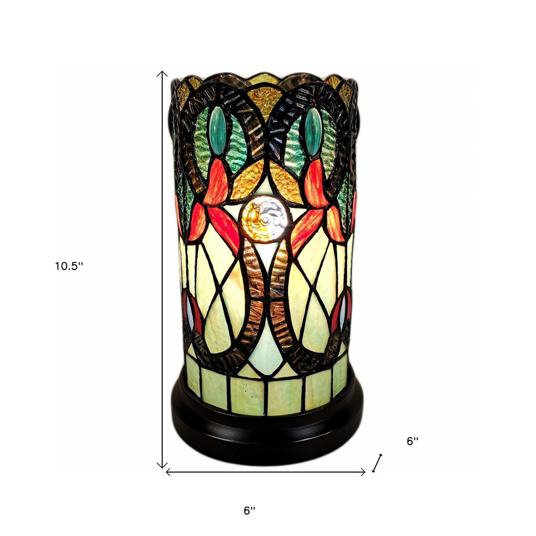 Add some warm light and classic beauty to your space with this 10.5" mosaic tile stained glass accent table lamp. Hand-crafted with the same techniques used by the original Tiffany lamp makers, the multi-colored pieces of glass for this cylindrical piece are fused together to create a lamp that is also a colorful piece of art. Glass is hand cut to the perfect shape and size, wrapped in copper foil, and soldered together to create this stained glass beauty. Sitting atop a round resin base, this mini lamp is ideal for end table, desk, nightstand, or mantle. 10.5-inch H x 5-inch W x 5-inch D