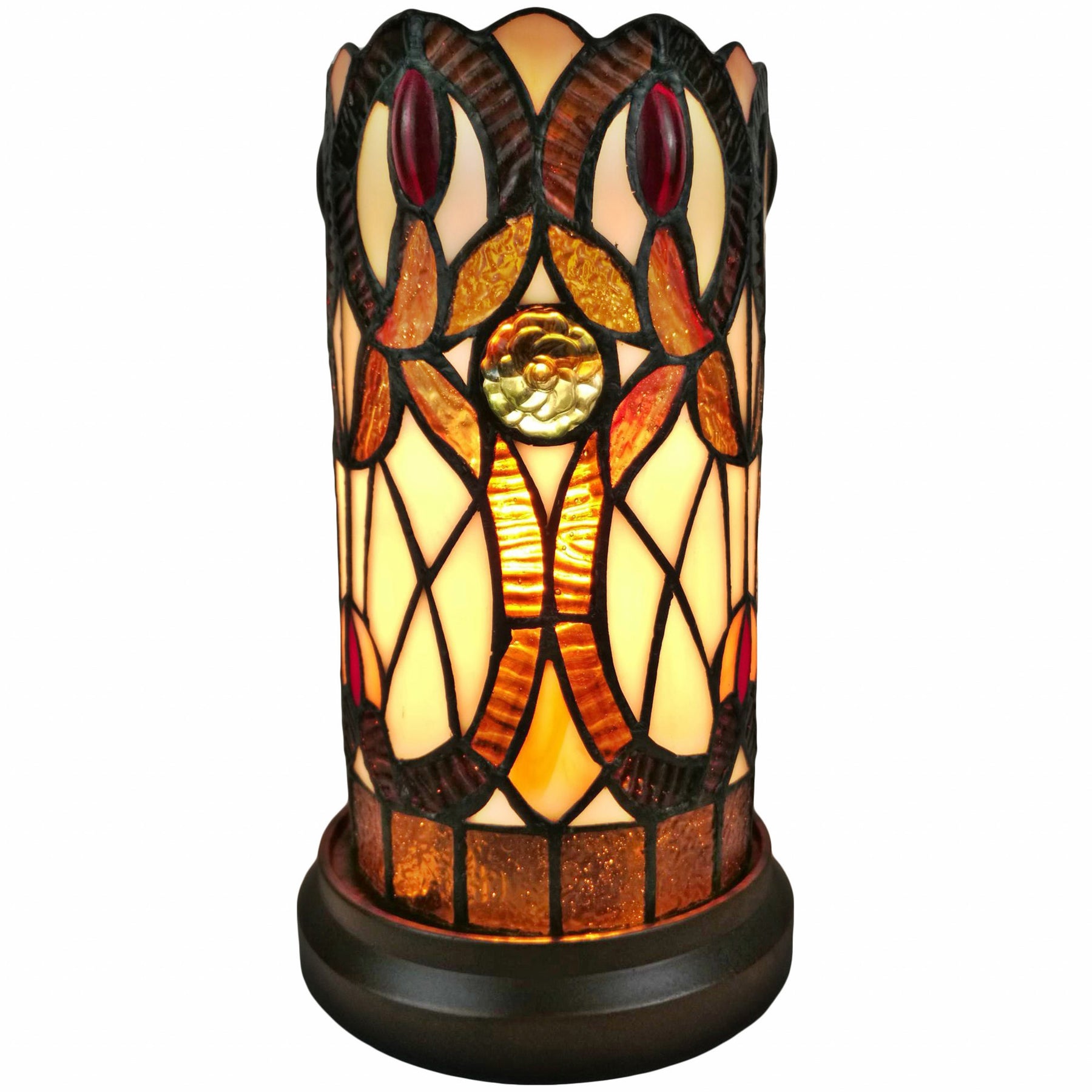 Add some warm light and classic beauty to your space with this 10.5" geometric floral stained glass accent table lamp. Hand-crafted with the same techniques used by the original Tiffany lamp makers, the multi-colored pieces of glass for this cylindrical piece are fused together to create a lamp that is also a colorful piece of art. Glass is hand cut to the perfect shape and size, wrapped in copper foil, and soldered together to create this stained glass beauty. Sitting atop a round resin base, this mini lamp is ideal for end table, desk, nightstand, or mantle. 10.5-inch H x 5-inch W x 5-inch D