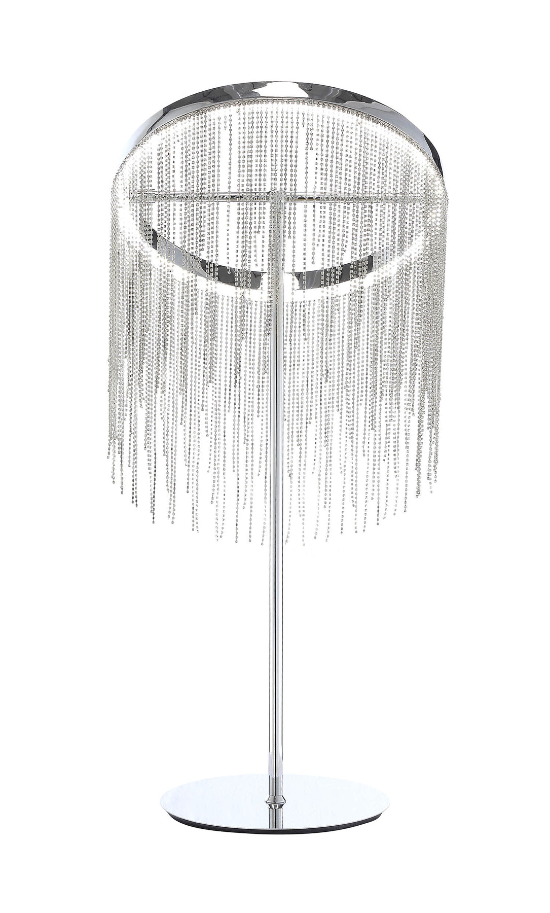 Beautify your living room or bedroom with this contemporary style metal table lamp. The elegant piece details an exquisite design and a sophisticated finishing. The base is made with chrome finished metal to offer sturdy support and stunning design. Our lamp features a glowing beaded drum shade with a rocker switch on power cable. This magnificent table lamp comes in a drum shape with beads to offer LED light that will brighten any atmosphere. We back our lamp to create an ambience of peace and light in any home setting.