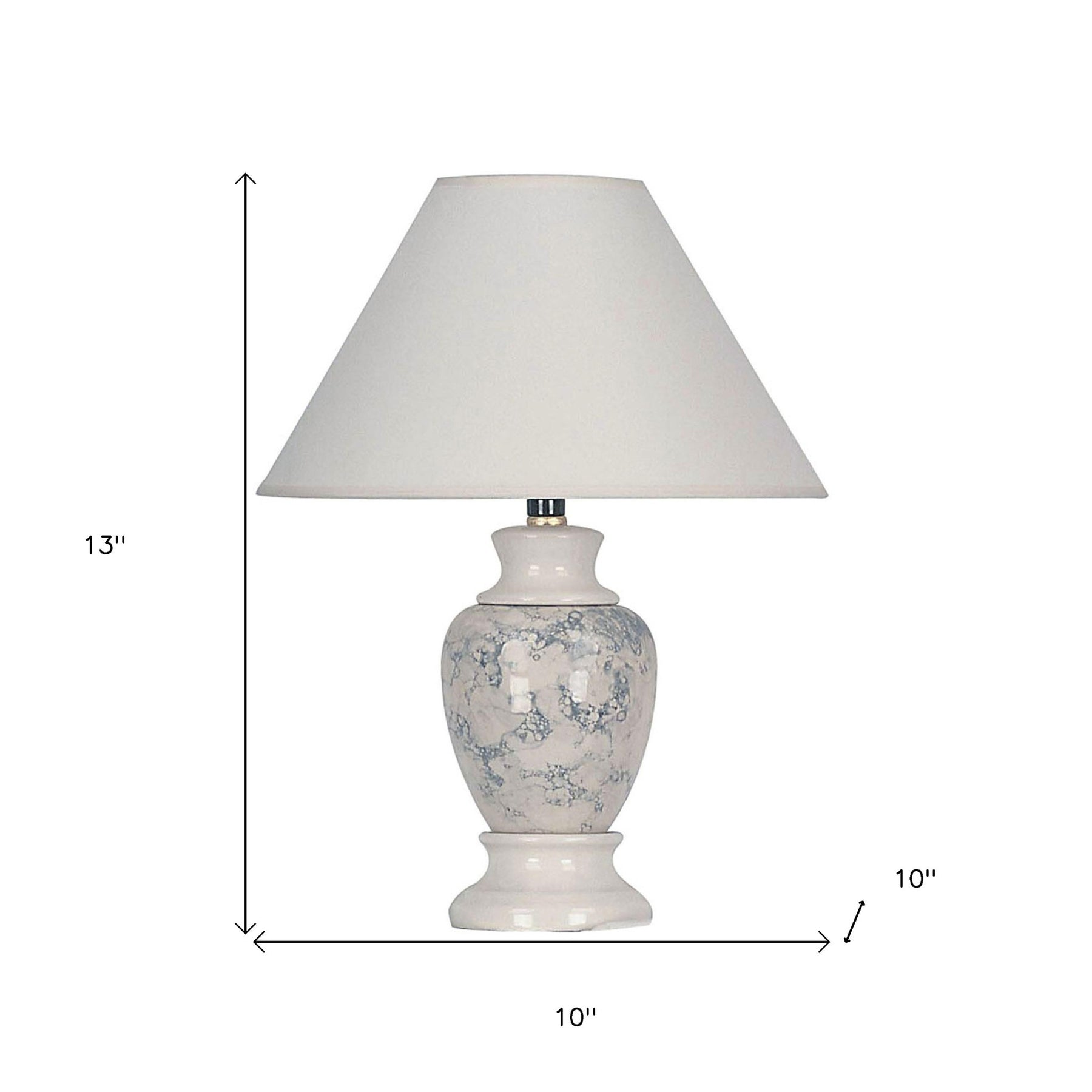 Add a touch of contemporary design to any space in your home with this this 13-inch ivory faux marble ceramic accent lamp with white empire shade will be a great addition to your space. The base of this lamp gives way to an curved urn shape boy that is finished in a faux marble look with gray/blue veining to it. The white empire fabric shade finishes this piece off nicely and symmetrically for a unique and stylish look. Accent lamps help to add a soft and cozy glow to your bedroom. 13-inch H x 10-inch W x 10-inch D
