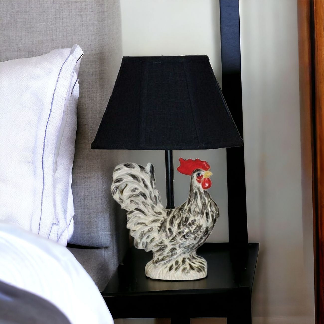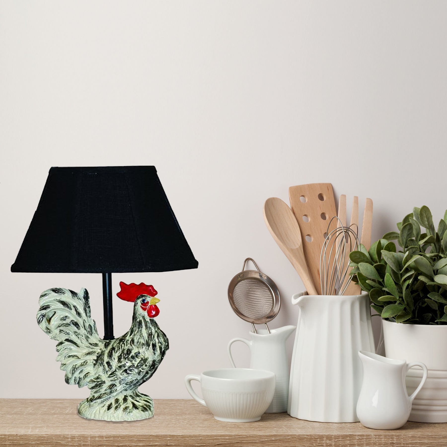 Embrace the good life with this hard working and stylish 13-inch rustic farmhouse rooster accent lamp with black shade. The lamp is made of sturdy porcelain and features a white color. The black shade has a empire shape and is made from fabric. This standard table lamp is designed to provide general lighting to the area. Use this lamp anywhere and elevate the look of the whole space. The perfect lamp to create just the right natural and soothing light in your space. 13-inch H x 6-inch W x 6-inch D