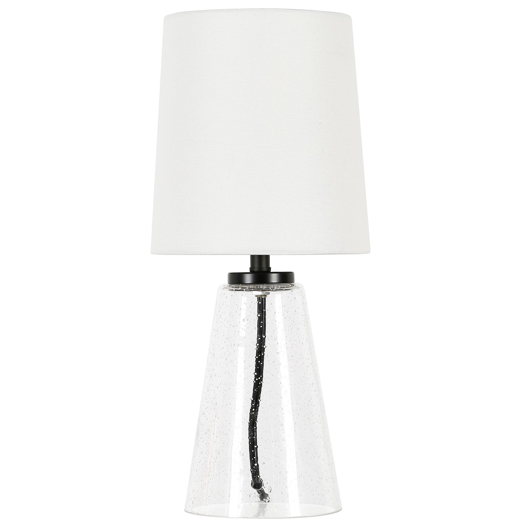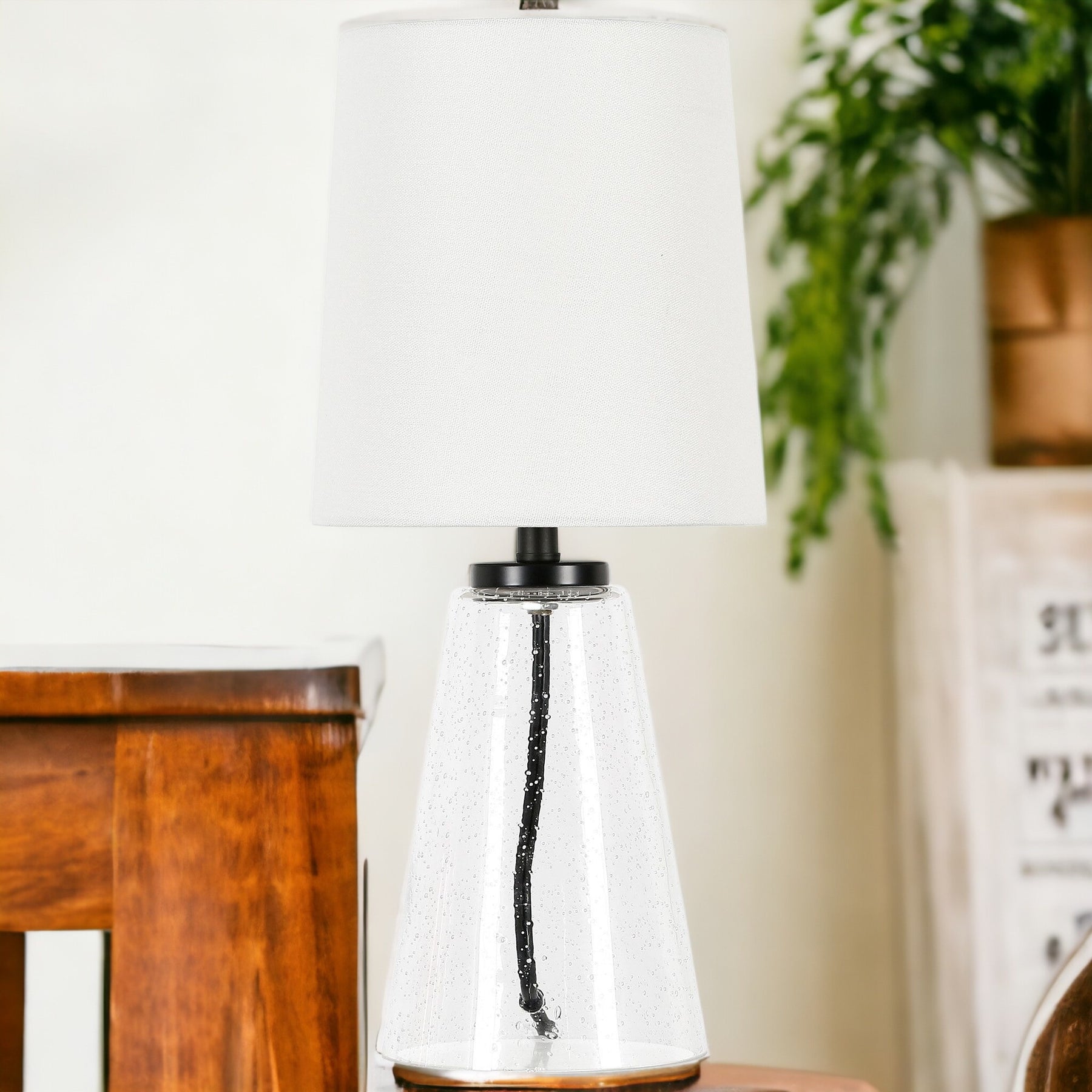 This 16-inch clear glass geometric table lamp with white drum shade is the perfect combination of design and function. The base of this lamp is made of glass finished in a clear tone. The white shade has a drum shape and is made of fabric, which makes it a perfect choice. This standard table lamp is designed to provide general lighting to the area. High quality design makes this a great lamp for not only lighting, but accenting a room with style. It is perfect for virtually any decor. 15.75-inch H x 7-inch W x 7-inch D