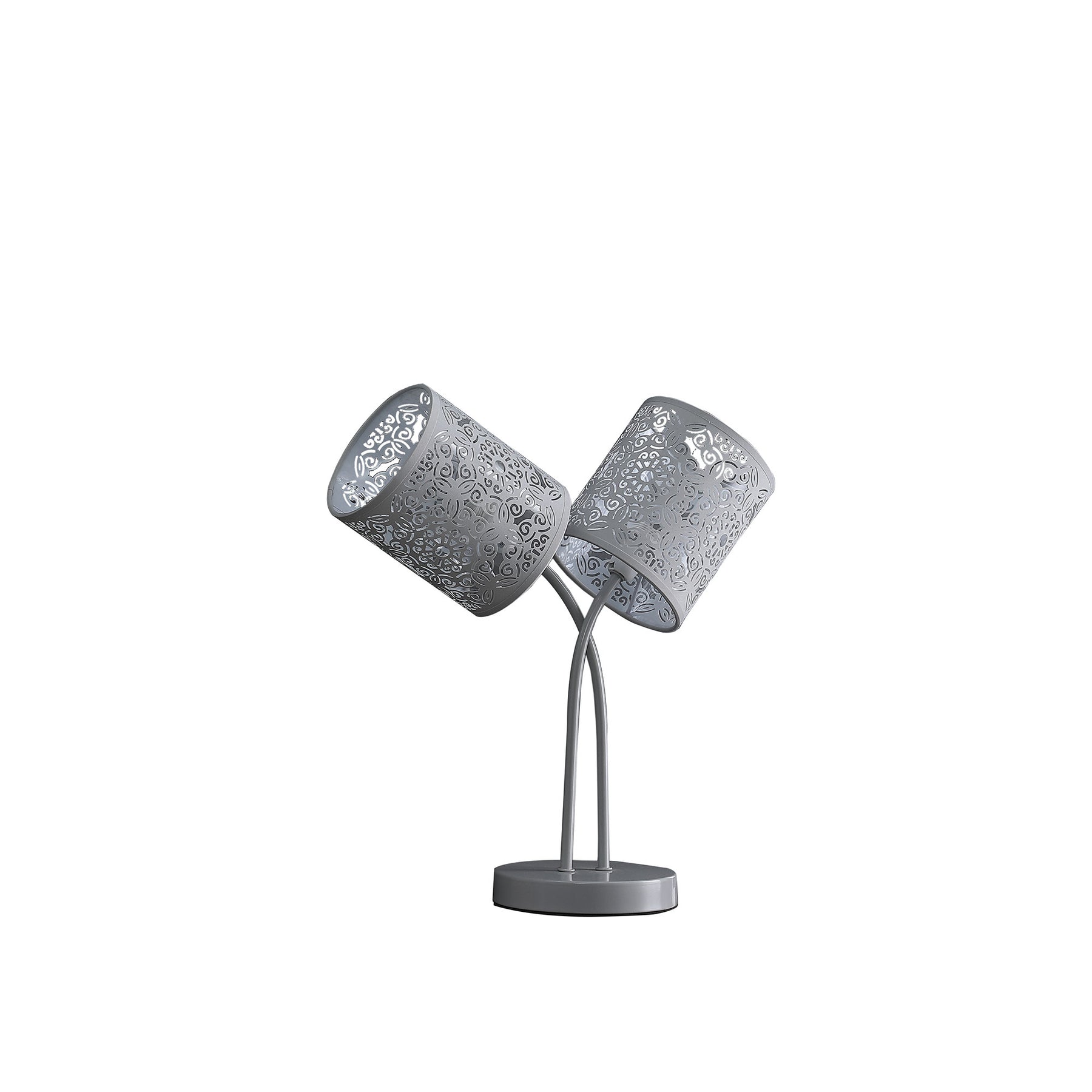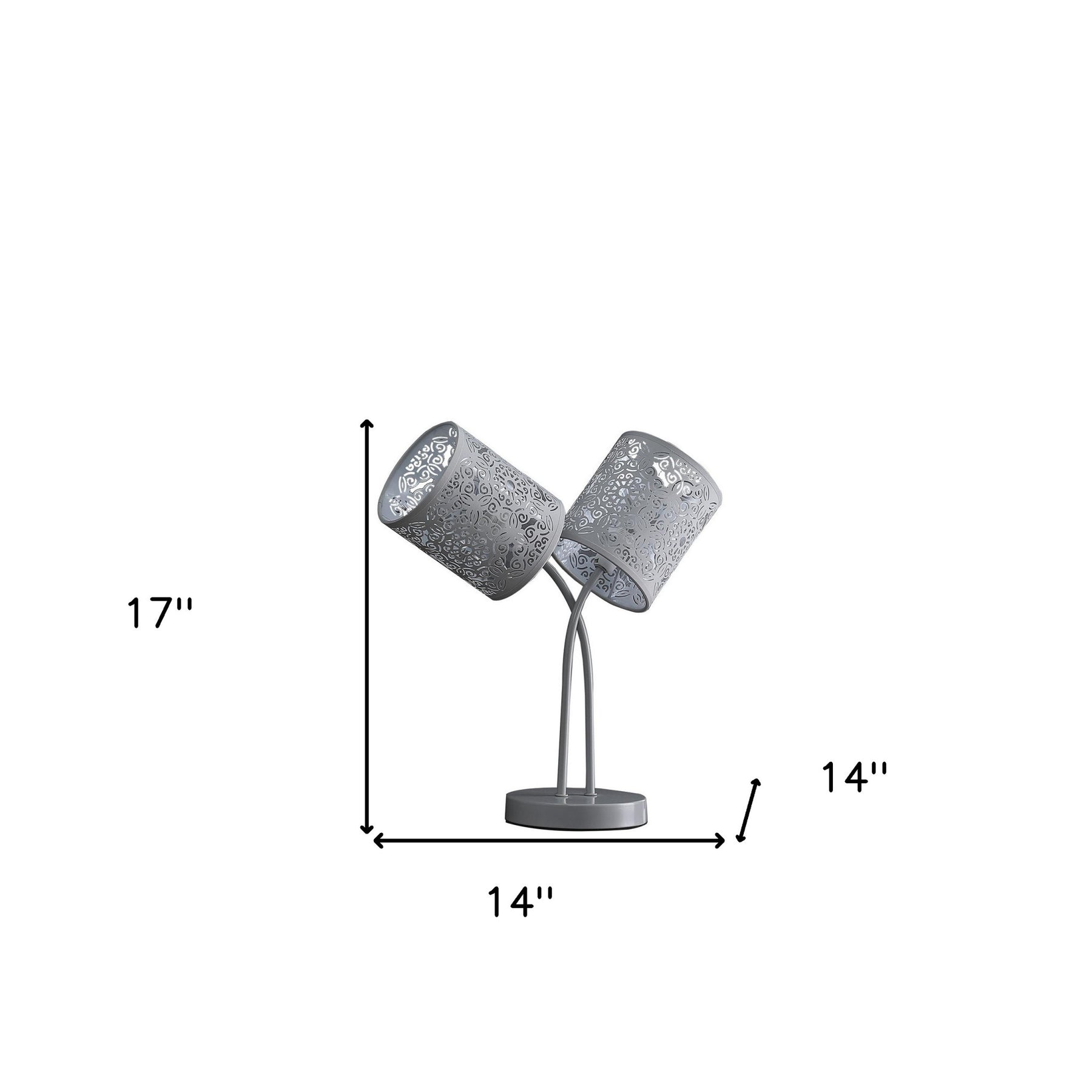 Truly a mix of design and functionality that doesn't compromise on style, this 17" light gray metal two light bedside table lamp with light gray abstract drum shade will be a great addition to your space. The lamp is made of sturdy metaland features a light gray color. Bedside table lamps help to add a soft and cozy glow to your bedroom. Great for evening reading! Use this lamp anywhere and elevate the look of the whole space. It is perfect for virtually any decor. 17" H x 14" W x 14" D