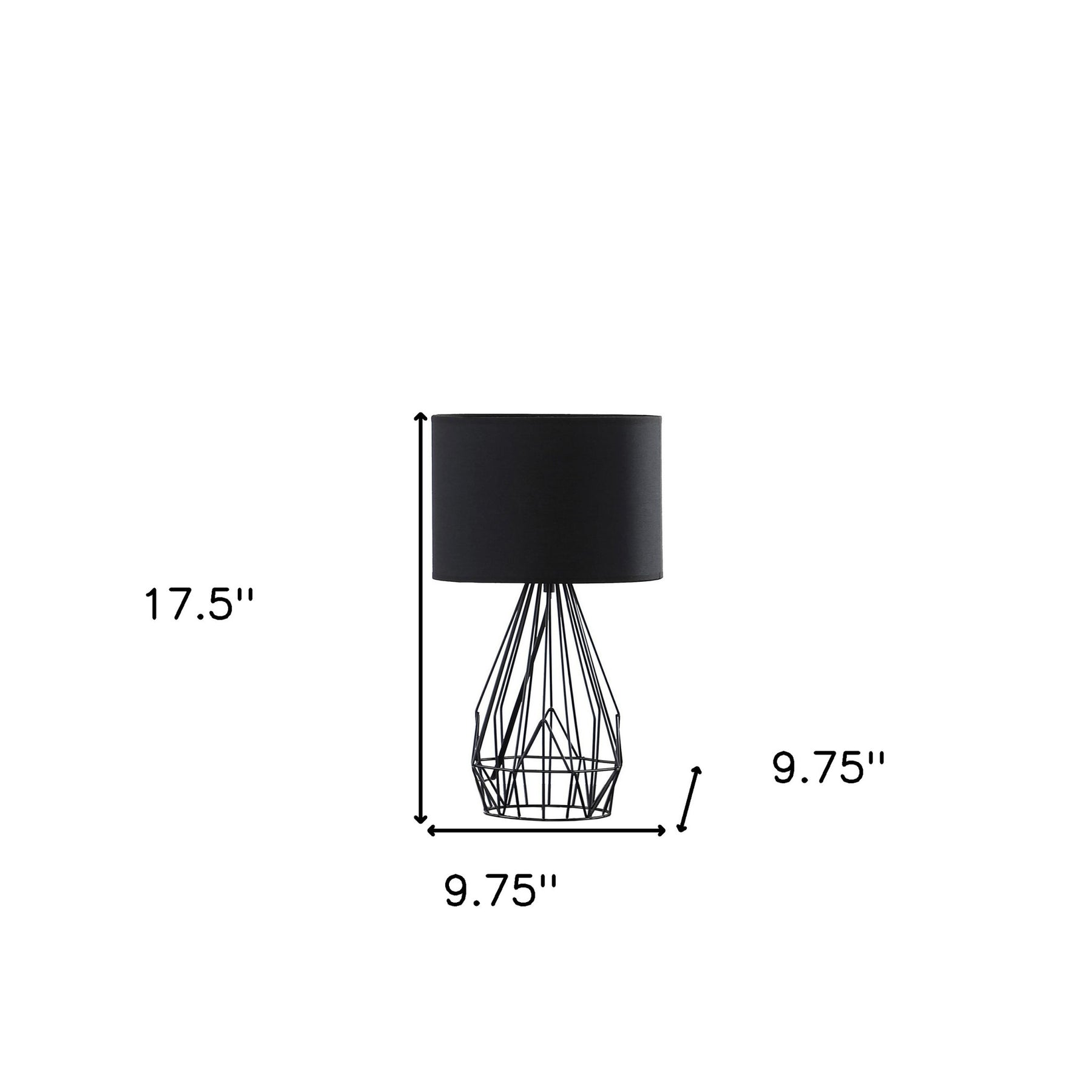 With its modern and industrial style, this 18” Asymmetric Black Cage Metal Table Lamp is the perfect lamp fixture to bring into your home. Made from high quality metal, this lamp features a classic drum shade and a black open cage body and base, made from slim metal rods. The lampshade also has a clean-lined smooth black fabric with a rose copper lining to diffuse light evenly. There is an easy to reach power switch on the attached chord, which makes it even more perfect for you. 17.5” x 9.75” x 9.75”