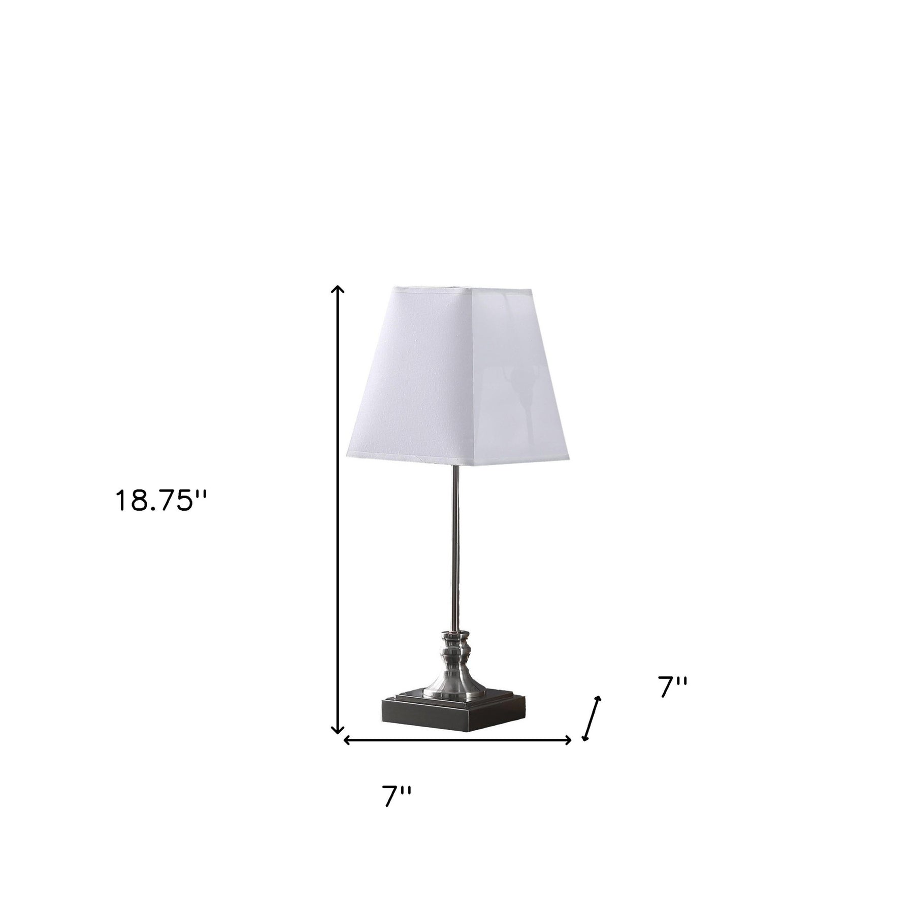 Embrace the good life with this hard working and stylish 19" silver bedside table lamp with white empire shade. The white empire metal shade is finishes this piece off nicely and symmetrically Bedside table lamps help to add a soft and cozy glow to your bedroom. Great for evening reading! Use this lamp anywhere and elevate the look of the whole space. Bring some lite and good vibes into your space with this updated and stylishly designed lamp. 18.75" H x 7" W x 7" D