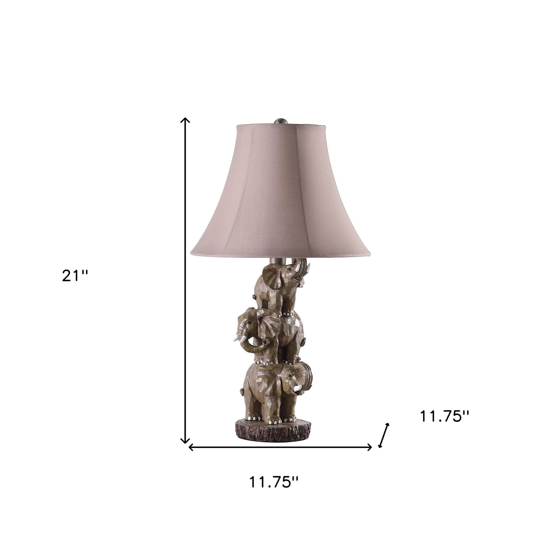 This 21" brown elephant trio table lamp with brown bell shade is the perfect combination of design and function. The base of this lamp is made of polyresin finished in a brown tone that features three elephants standing on top of each other. The brown shade has a bell shape and is made of fabric, which makes it a perfect choice. This standard table lamp is designed to provide general lighting to the area. The light that this lamp throws is soft and warm to elevate the look of most any space in your home. It is perfect for virtually any decor. 21" H x 11.75" W x 11.75" D