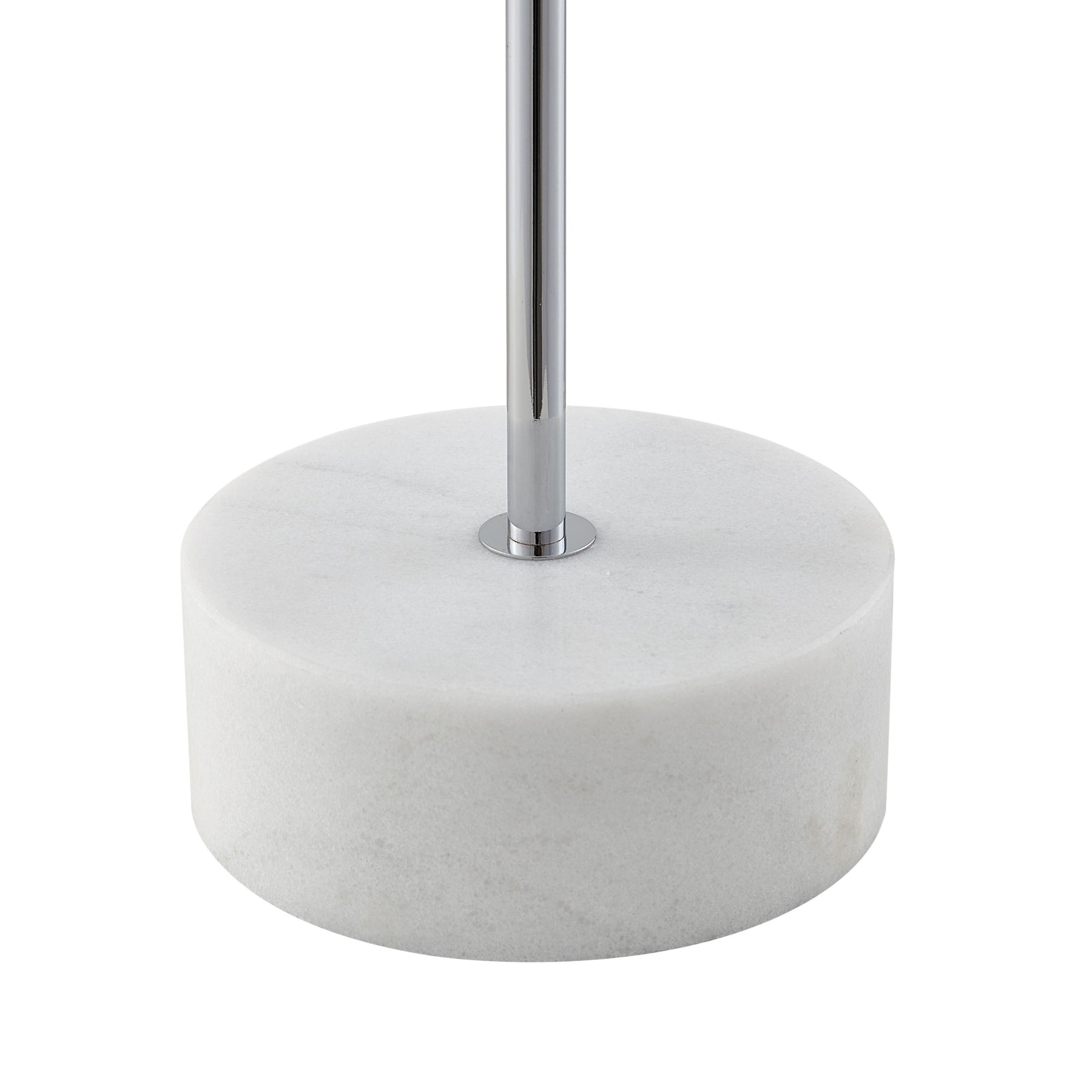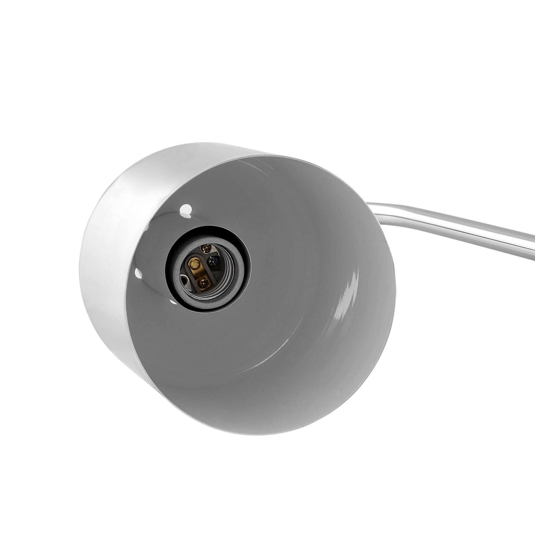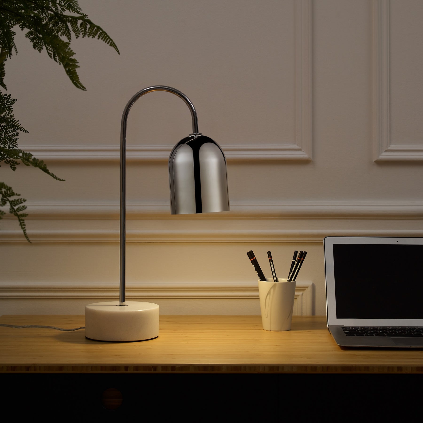 • Modern desk table lamp with a silver metallic shade and base finish in white.