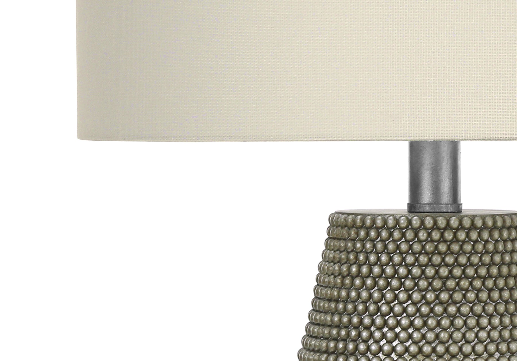 This 24-inch gray round table lamp with ivory drum shade is the perfect combination of design and function. The base of this lamp is made of textured polyresin finished in a gray tone. Includes a ivory linen, drum shaped shade, making this a fashionable piece that will complement most any interior. This standard table lamp is designed to provide general lighting to the area. High quality design makes this a great lamp for not only lighting, but accenting a room with style. The perfect lamp to create just the right natural and soothing light in your space. 23.5-inch H x 14-inch W x 14-inch D