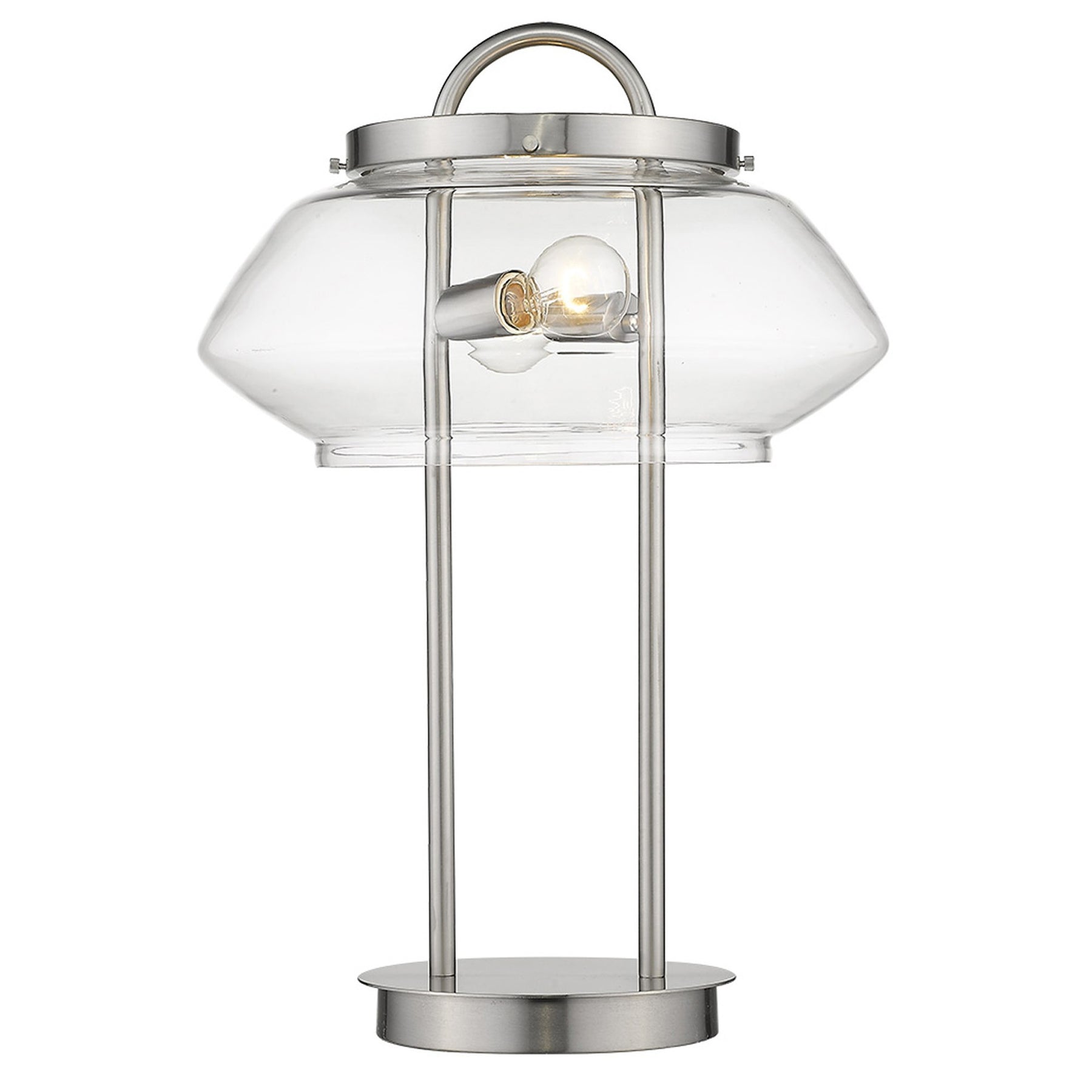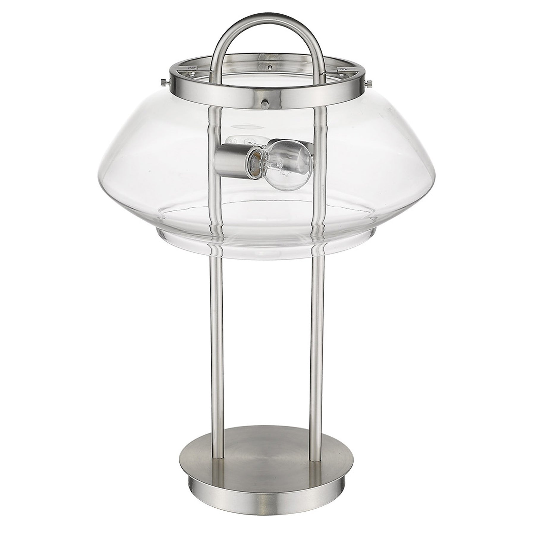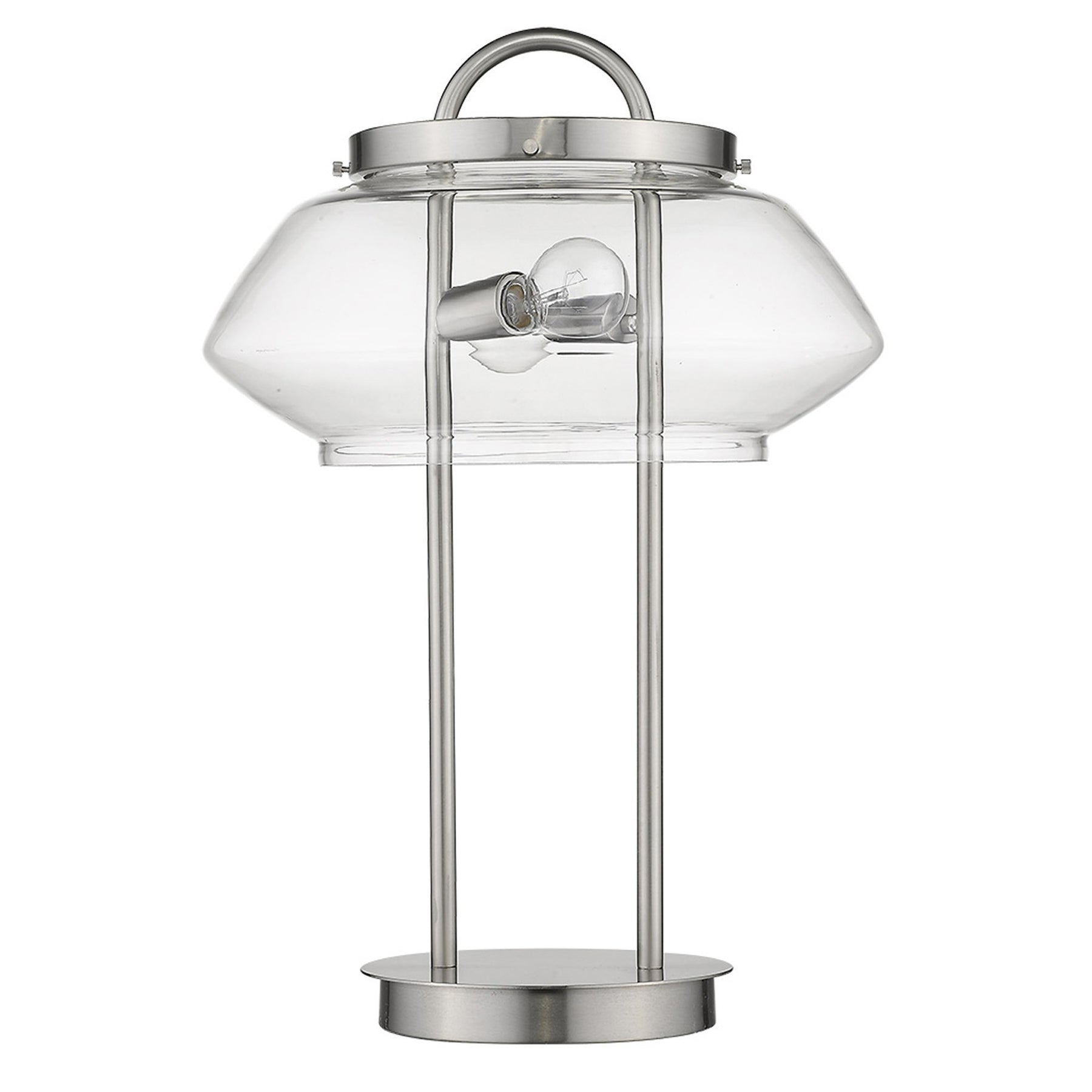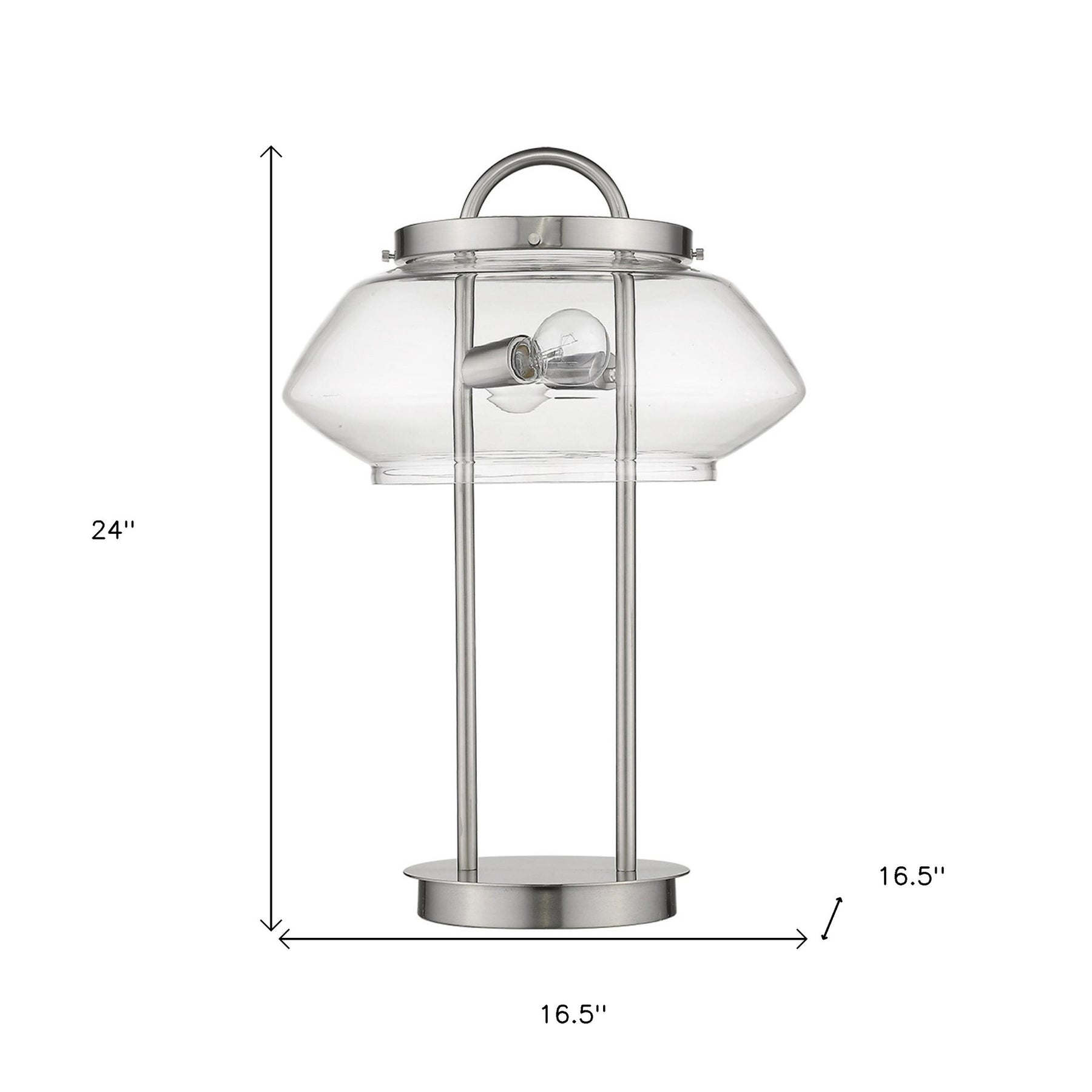 Truly a mix of design and functionality that doesn't compromise on style, this 24" silver metal two light table lamp with clear novelty shade will be a great addition to your space. A gorgeous silver metalbase brings just the right amount of pizzazz to this fabulous lamp. The clear shade has a novelty shape and is made of glass, which makes it a perfect choice. This standard table lamp is designed to provide general lighting to the area. High quality design makes this a great lamp for not only lighting, but accenting a room with style. The perfect lamp to create just the right natural and soothing light in your space. 24" H x 16.5" W x 16.5" D