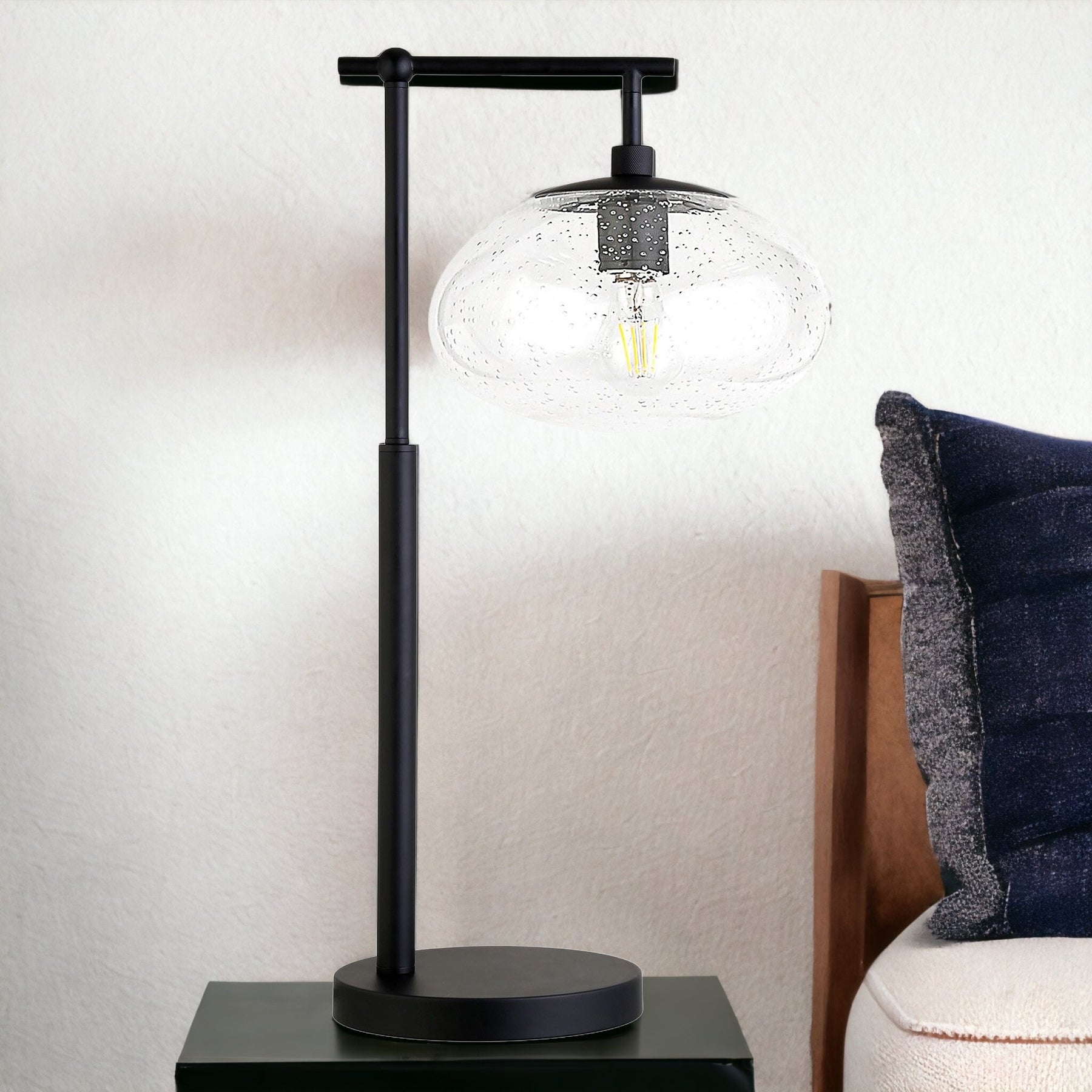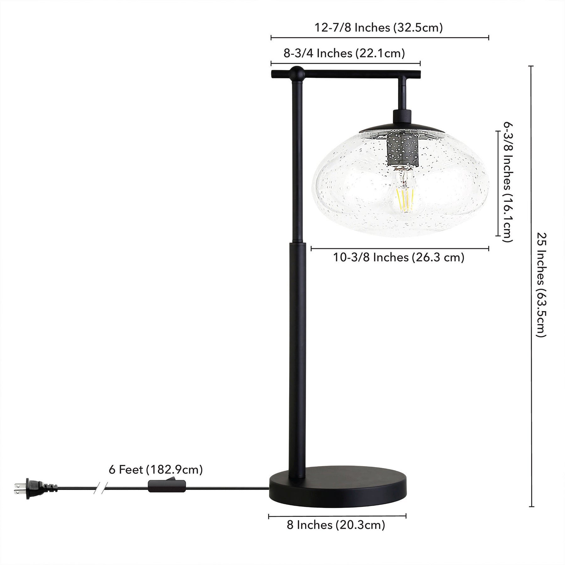 Truly a mix of design and functionality that doesn't compromise on style, this 25-inch black metal arched table lamp with clear seeded globe shade will be a great addition to your space. The base of this lamp is made of metal finished in a black tone. The clear globe glass shade is a great compliment to this lamp. A sophisticated take on a classic, this arched table lamp is a great option for a unique look. The light that this lamp throws is soft and warm to elevate the look of most any space in your home. The perfect lamp to create just the right natural and soothing light in your space. 25-inch H x 13-inch W x 10-inch D