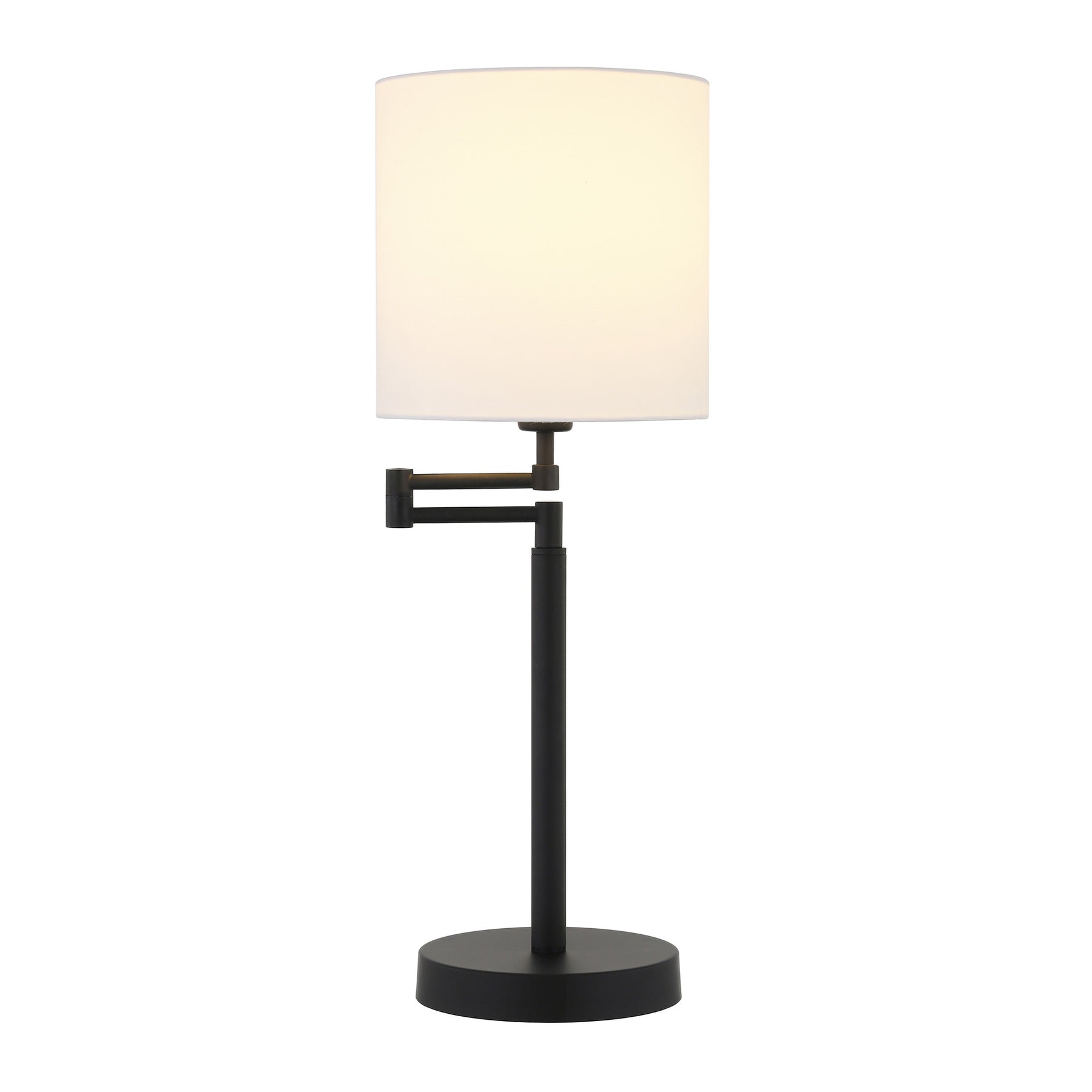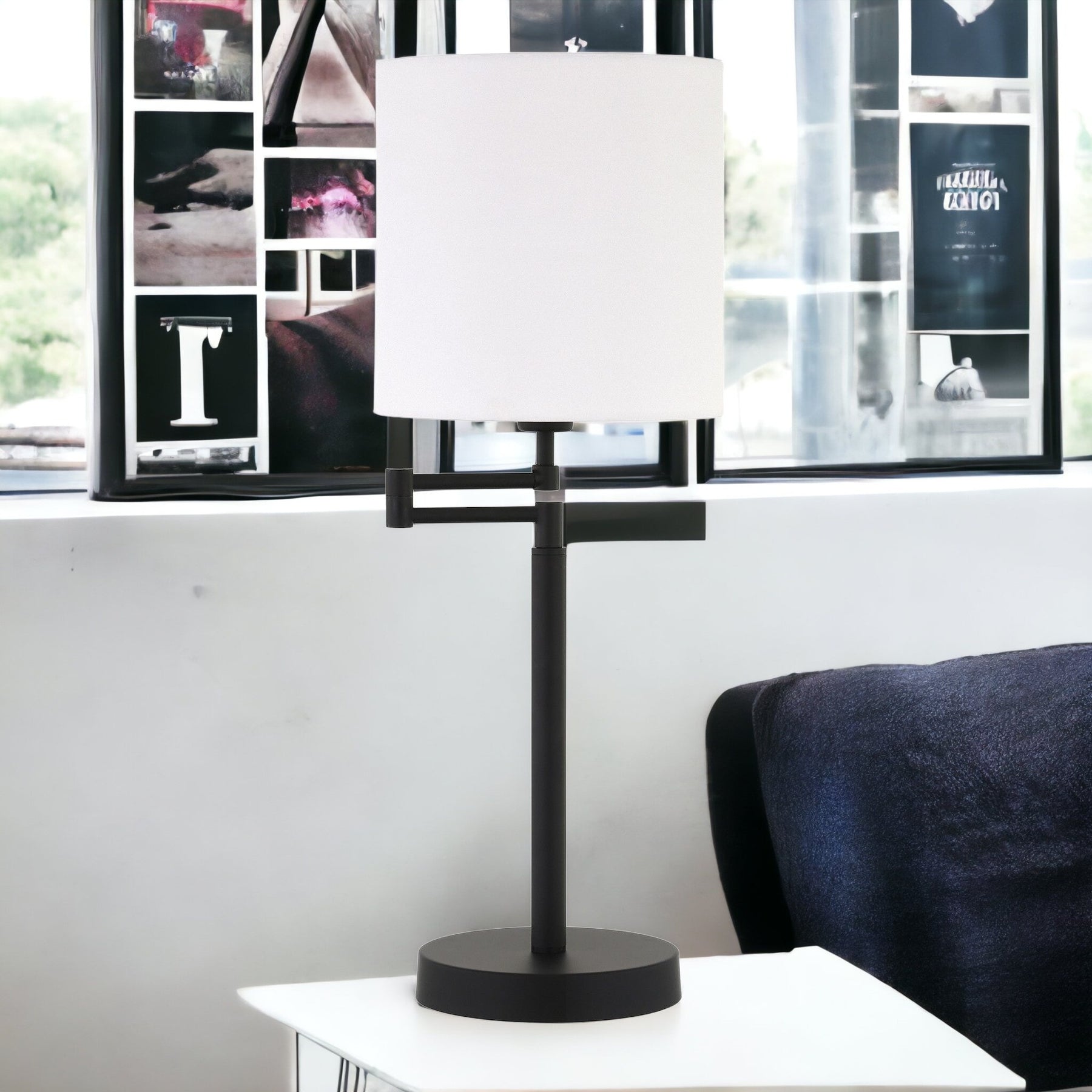 Truly a mix of design and functionality that doesn't compromise on style, this 25-inch black metal table lamp with white drum shade will be a great addition to your space. A gorgeous black metal base brings just the right amount of pizzazz to this fabulous lamp. The white drum fabric shade is finishes this piece off nicely and symmetrically this standard table lamp is designed to provide general lighting to the area. High quality design makes this a great lamp for not only lighting, but accenting a room with style. It is perfect for virtually any decor. 25-inch H x 13-inch W x 13-inch D
