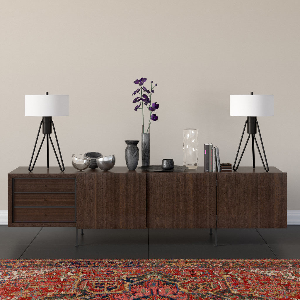 Truly a mix of design and functionality that doesn't compromise on style, this 25-inch black metal two light tripod table lamp with white drum shade will be a great addition to your space. The lamp is made of sturdy metal and features a black color. The white shade has a drum shape and is made of fabric, which makes it a perfect choice. A tripod base gives this lamp a unique and modern profile. Use this lamp anywhere and elevate the look of the whole space. It is perfect for virtually any decor. 25-inch H x 15-inch W x 15-inch D