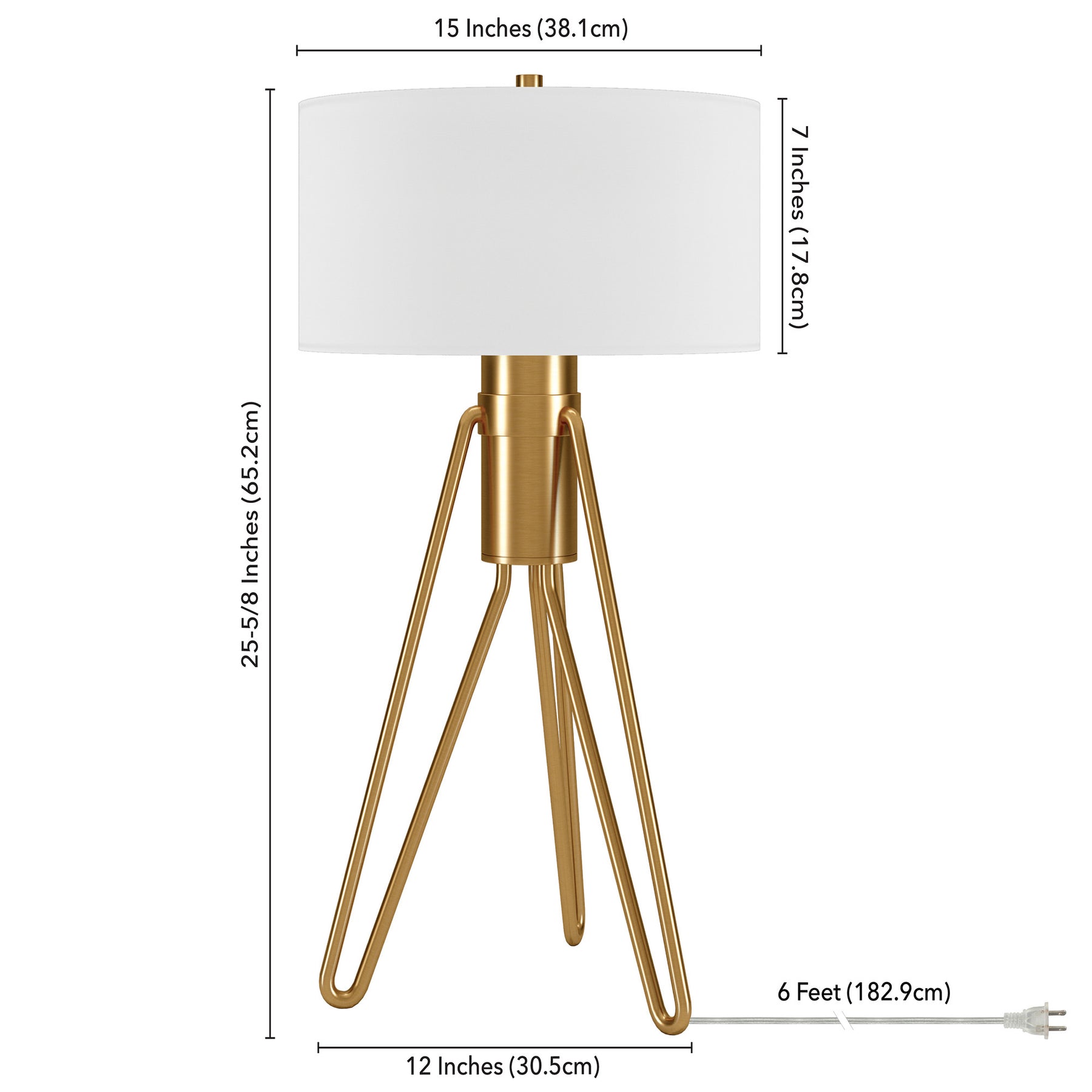 This 25-inch brass metal two light tripod table lamp with white drum shade is the perfect combination of design and function. The lamp is made of sturdy metal and features a brass color. The white shade has a drum shape and is made from fabric. A tripod base gives this lamp a unique and modern profile. The light that this lamp throws is soft and warm to elevate the look of most any space in your home. It is perfect for virtually any decor. 25-inch H x 15-inch W x 15-inch D