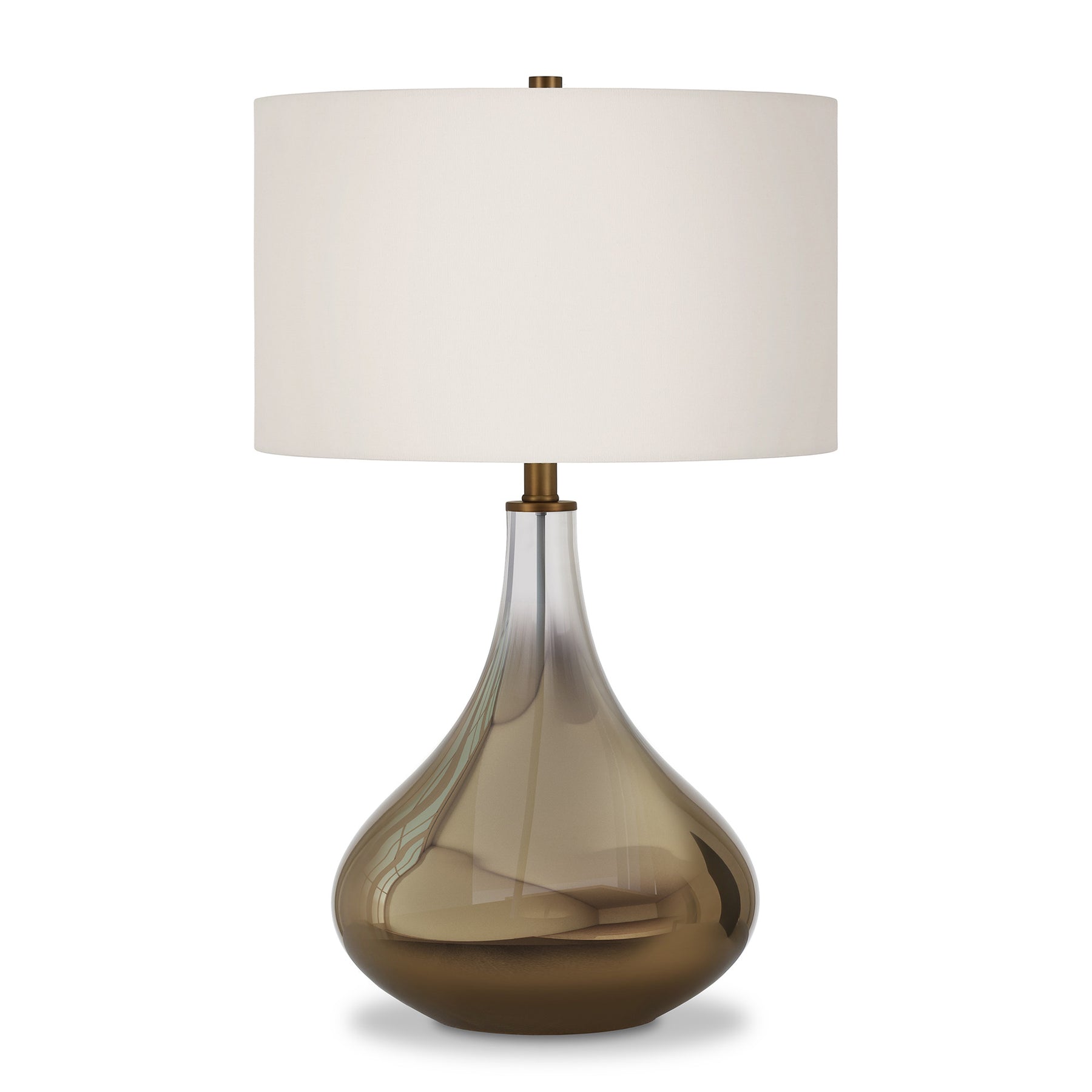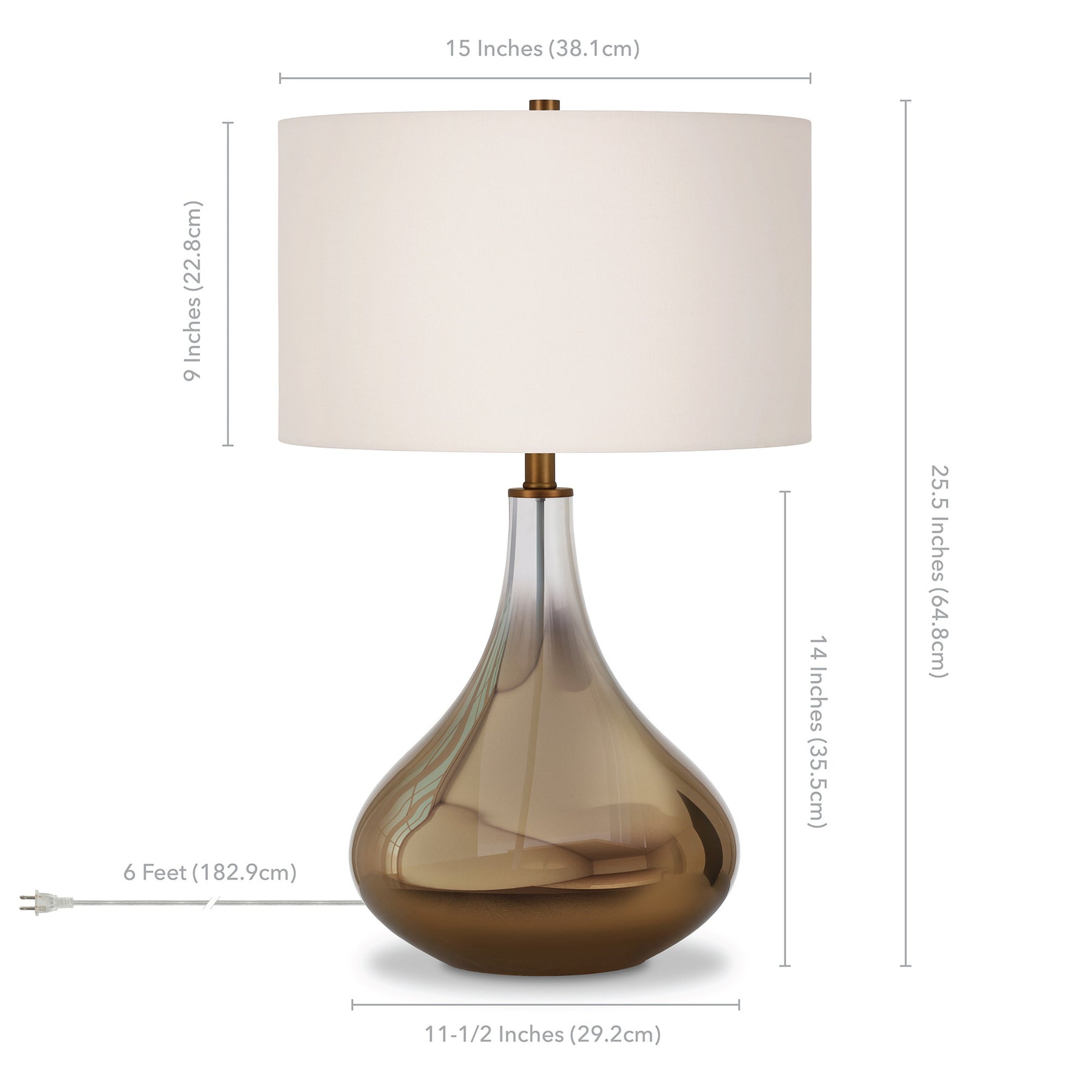 This 25-inch bronze glass table lamp with white drum shade is the perfect combination of design and function. The base of this lamp is made of glass finished in a bronze tone. The white drum fabric shade is finishes this piece off nicely and symmetrically this standard table lamp is designed to provide general lighting to the area. Use this lamp anywhere and elevate the look of the whole space. The perfect lamp to create just the right natural and soothing light in your space. 25-inch H x 15-inch W x 15-inch D