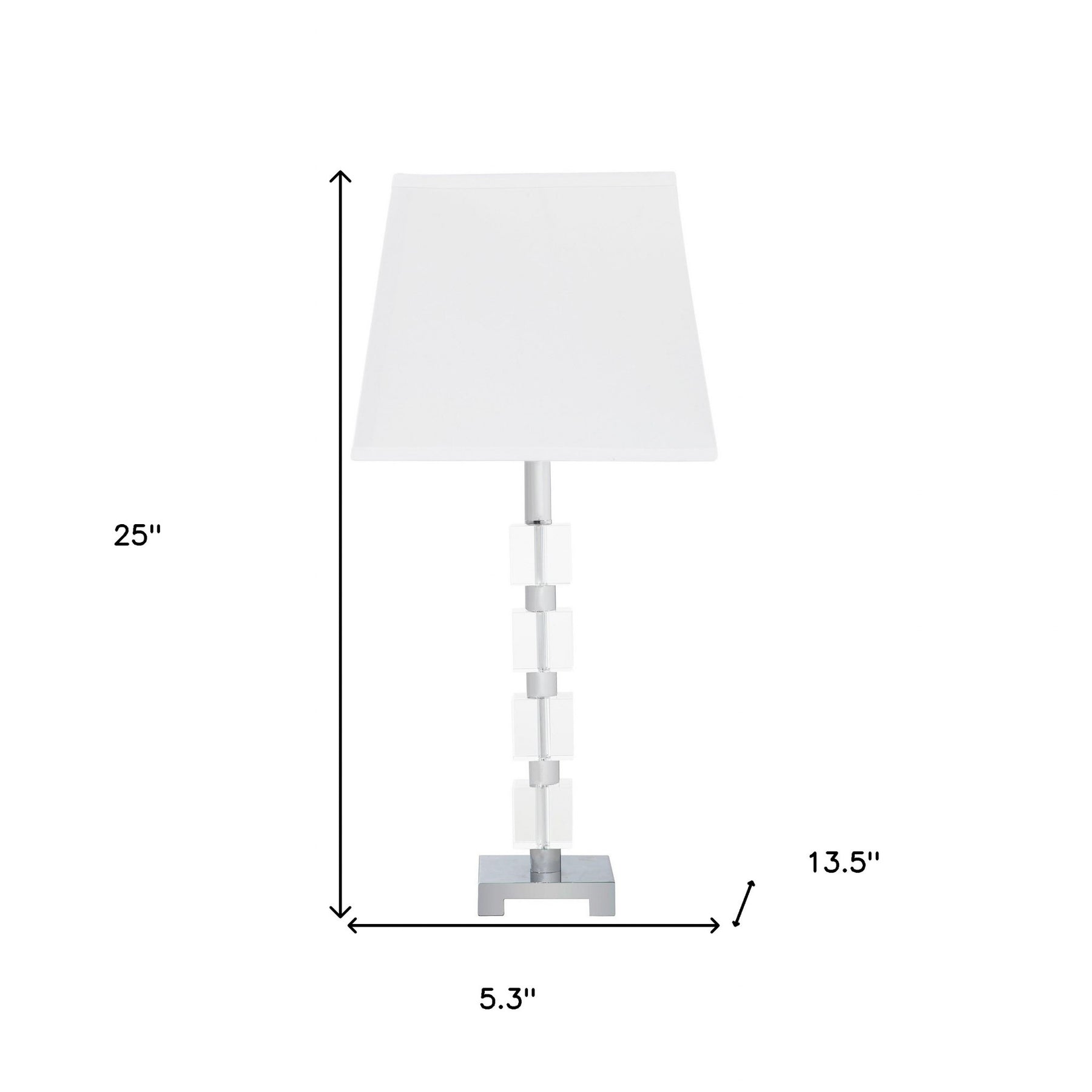 With this 25" crystal geo cubed table lamp with white sharp corner square tapered shade you can bring in design to any space along with adding some ambient lighting. The lamp is made of sturdy crystal and features a clear color that gives off a contemporary vibe. The lamp shade has a unique sharp corner square tapered shape and is made from fabric. Bedside table lamps help to add a soft and cozy glow to your bedroom. Great for evening reading! The light that this lamp throws is soft and warm to elevate the look of most any space in your home. The perfect lamp to create just the right natural and soothing light in your space. 25" H x 5.3" W x 13.5" D