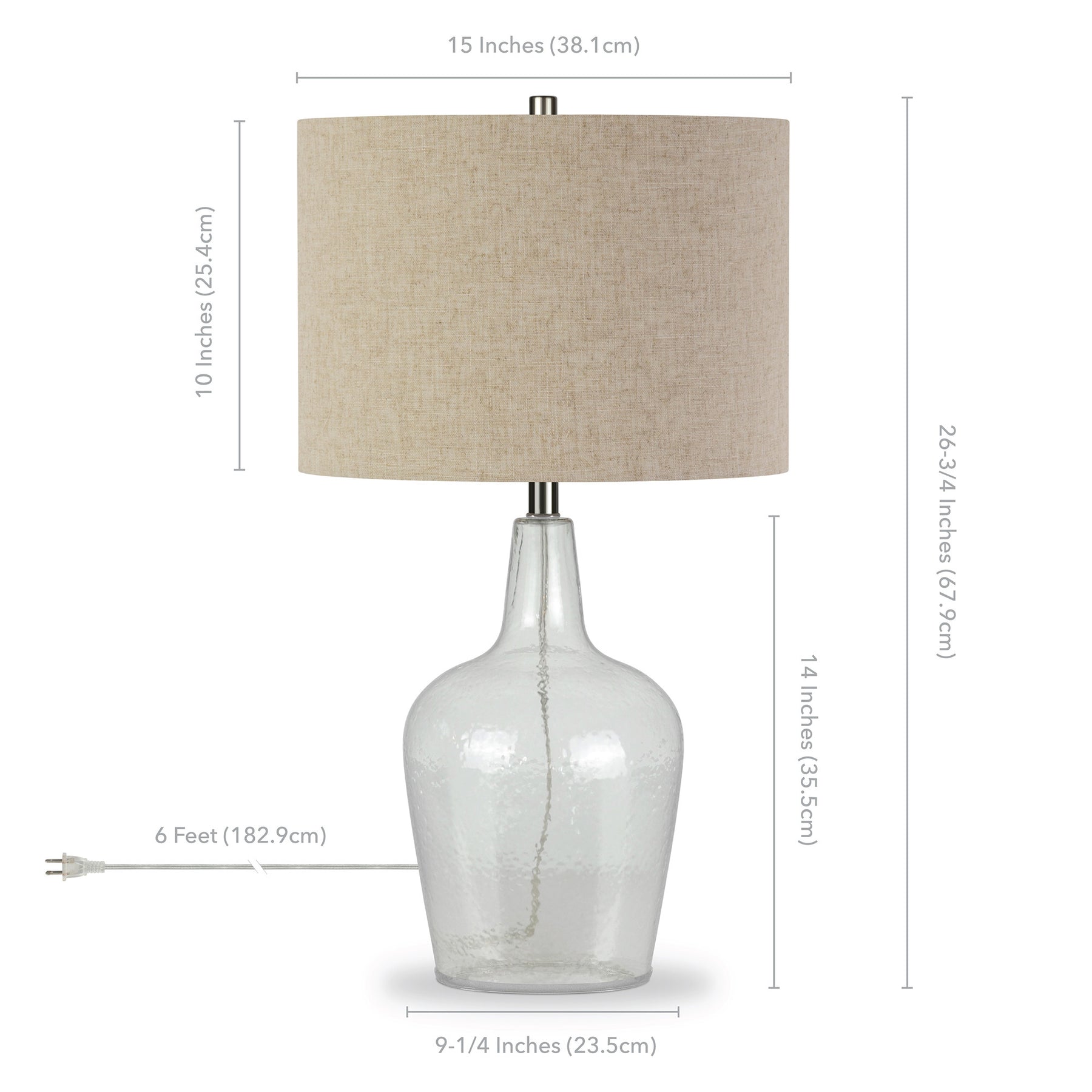 Bring of level of elegance and freshness to your space with this high quality 26-inch clear glass table lamp with flax drum shade. The base of this lamp is made of glass finished in a clear tone. The flax shade has a drum shape and is made from fabric. This standard table lamp is designed to provide general lighting to the area. The light that this lamp throws is soft and warm to elevate the look of most any space in your home. Bring some lite and good vibes into your space with this updated and stylishly designed lamp. 26-inch H x 15-inch W x 15-inch D