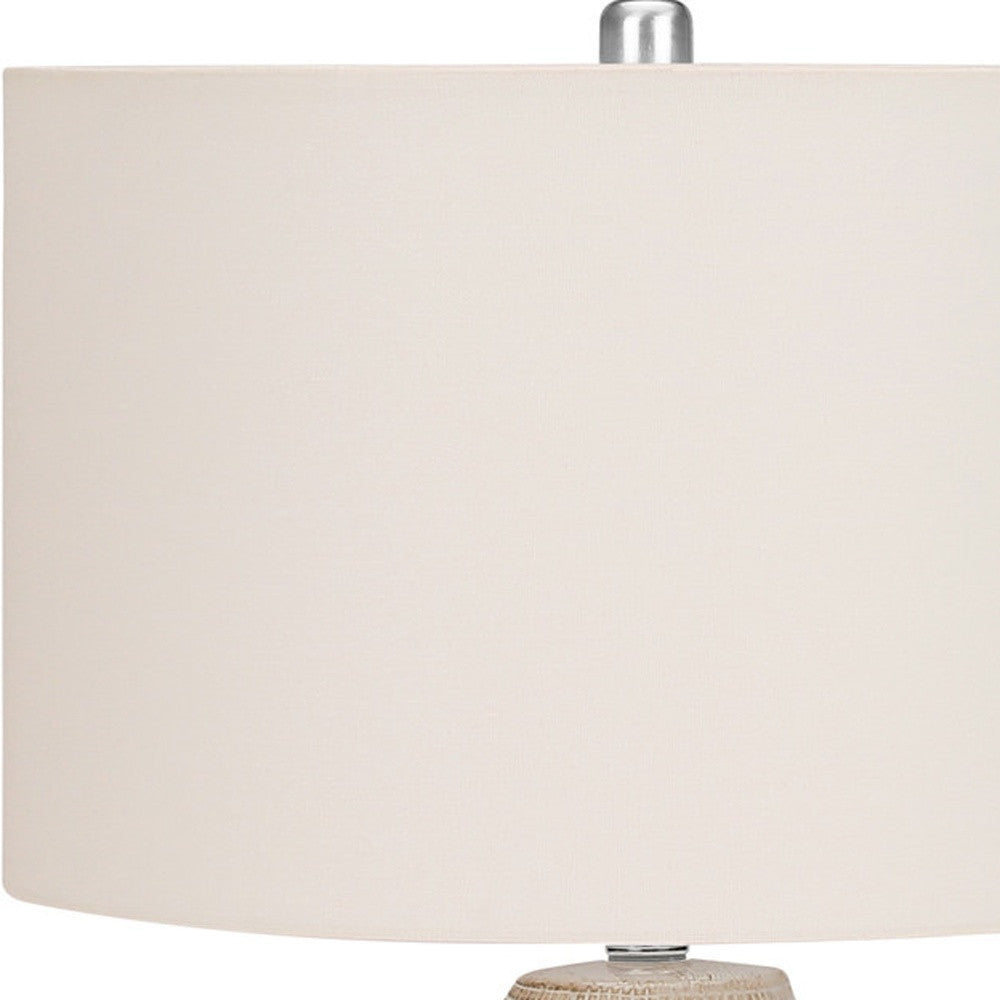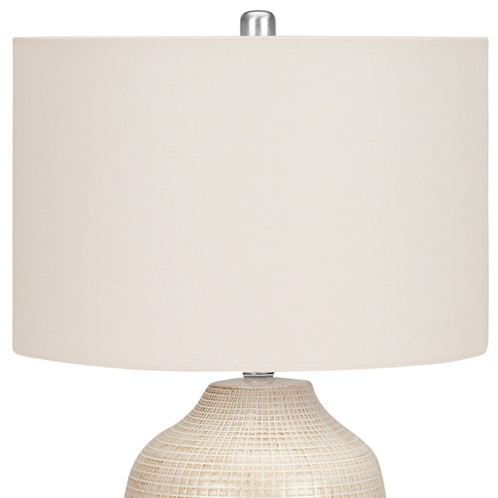 Bring of level of elegance and freshness to your space with this high quality 26-inch cream ceramic urn table lamp with cream drum shade. The base of this lamp is made of a gorgeous cream glazed ceramic with a geo texture design. The ivory/cream shade has a drum shape and is made of linen, which makes it a perfect choice. This standard table lamp is designed to provide general lighting to the area. The light that this lamp throws is soft and warm to elevate the look of most any space in your home. It is perfect for virtually any decor. 25.75-inch H x 16-inch W x 16-inch D
