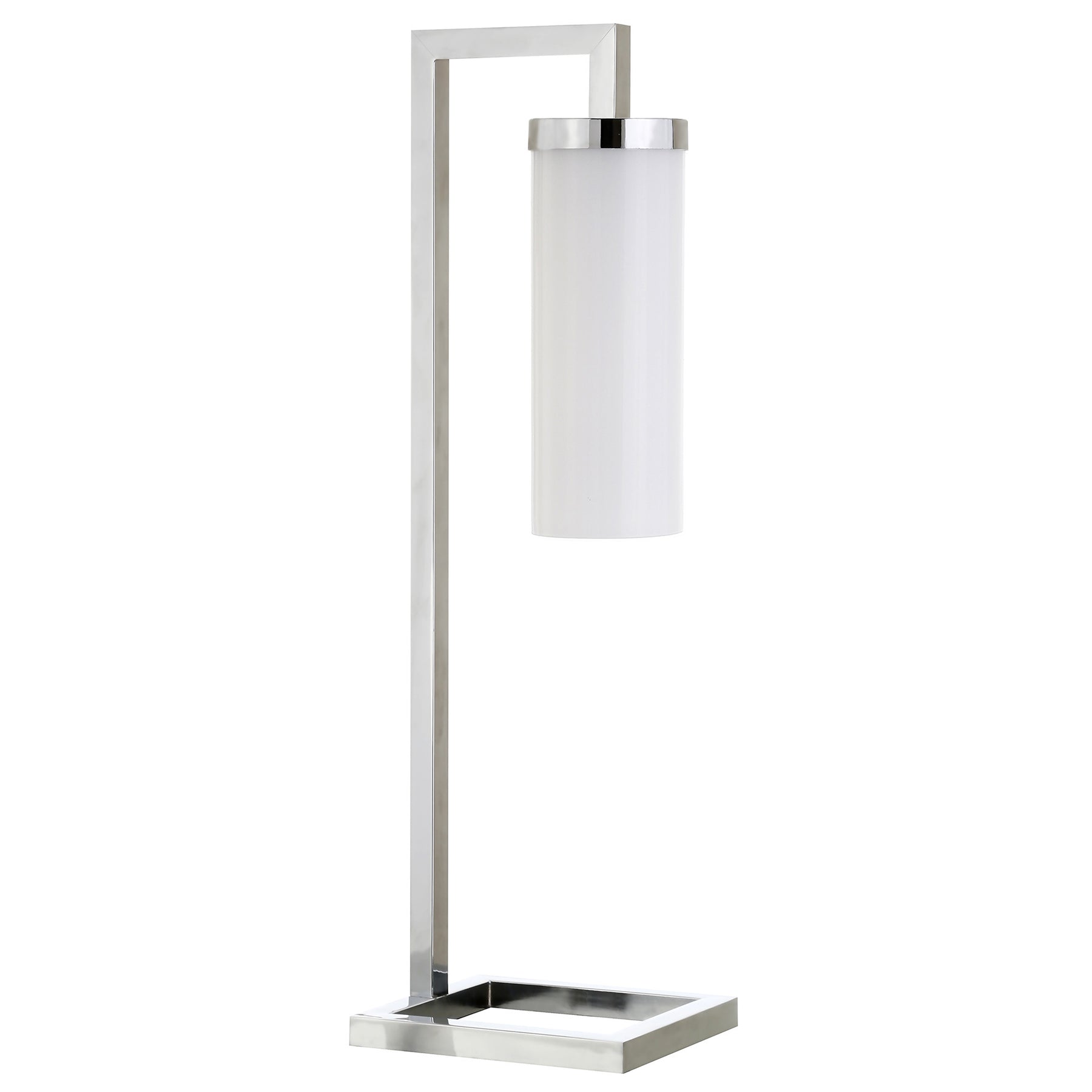 Embrace the good life with this hard working and stylish 26-inch nickel metal arched table lamp with white cylinder shade. The base of this lamp is made of metal finished in a nickel tone. The white cylinder glass shade is finishes this piece off nicely and symmetrically a sophisticated take on a classic, this arched table lamp is a great option for a unique look. The light that this lamp throws is soft and warm to elevate the look of most any space in your home. The perfect lamp to create just the right natural and soothing light in your space. 26-inch H x 8-inch W x 7-inch D