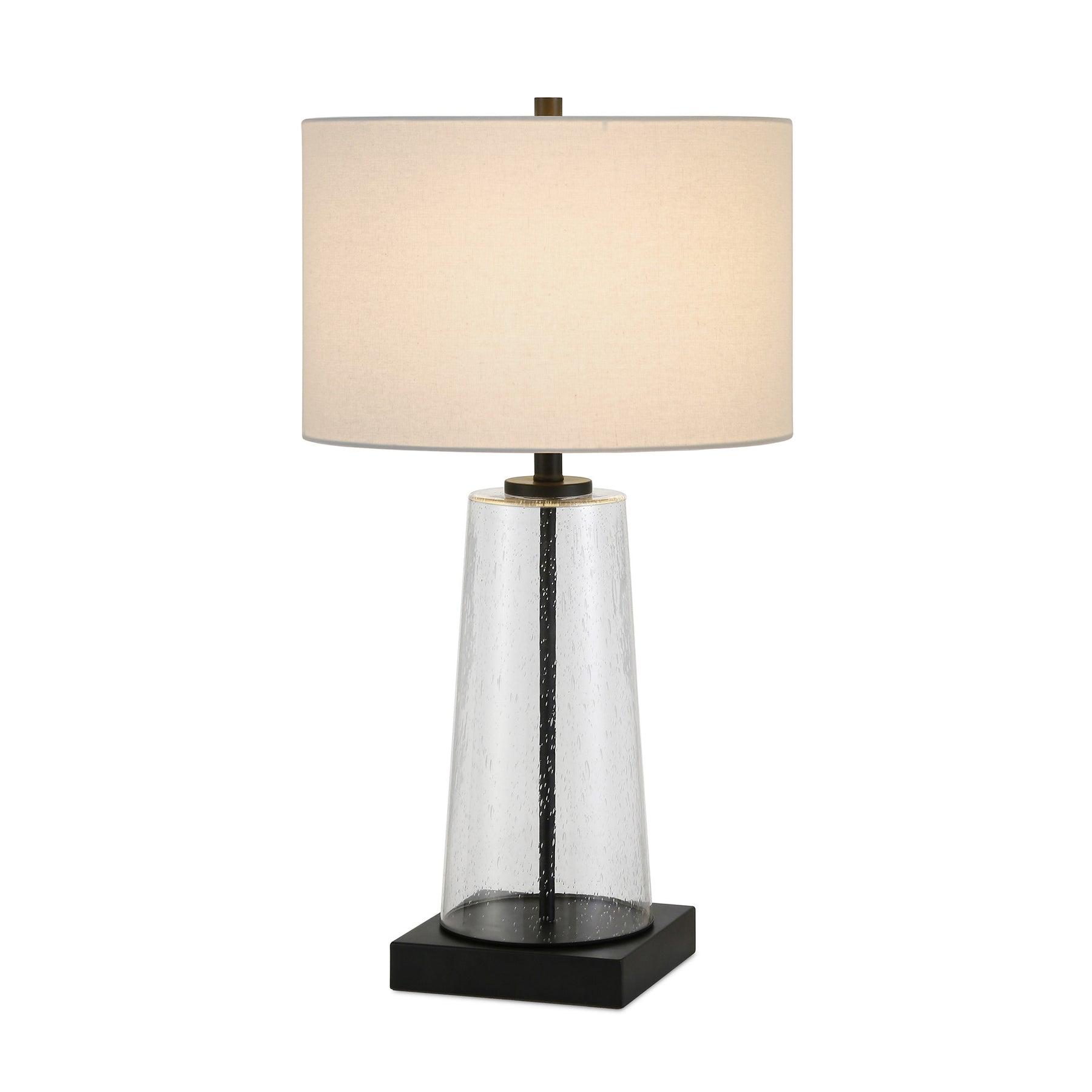 Truly a mix of design and functionality that doesn't compromise on style, this 27-inch black glass table lamp with white drum shade will be a great addition to your space. The base of this lamp is made of black glass. The white drum fabric shade is finishes this piece off nicely and symmetrically this standard table lamp is designed to provide general lighting to the area. High quality design makes this a great lamp for not only lighting, but accenting a room with style. Bring some lite and good vibes into your space with this updated and stylishly designed lamp. 27-inch H x 15-inch W x 15-inch D