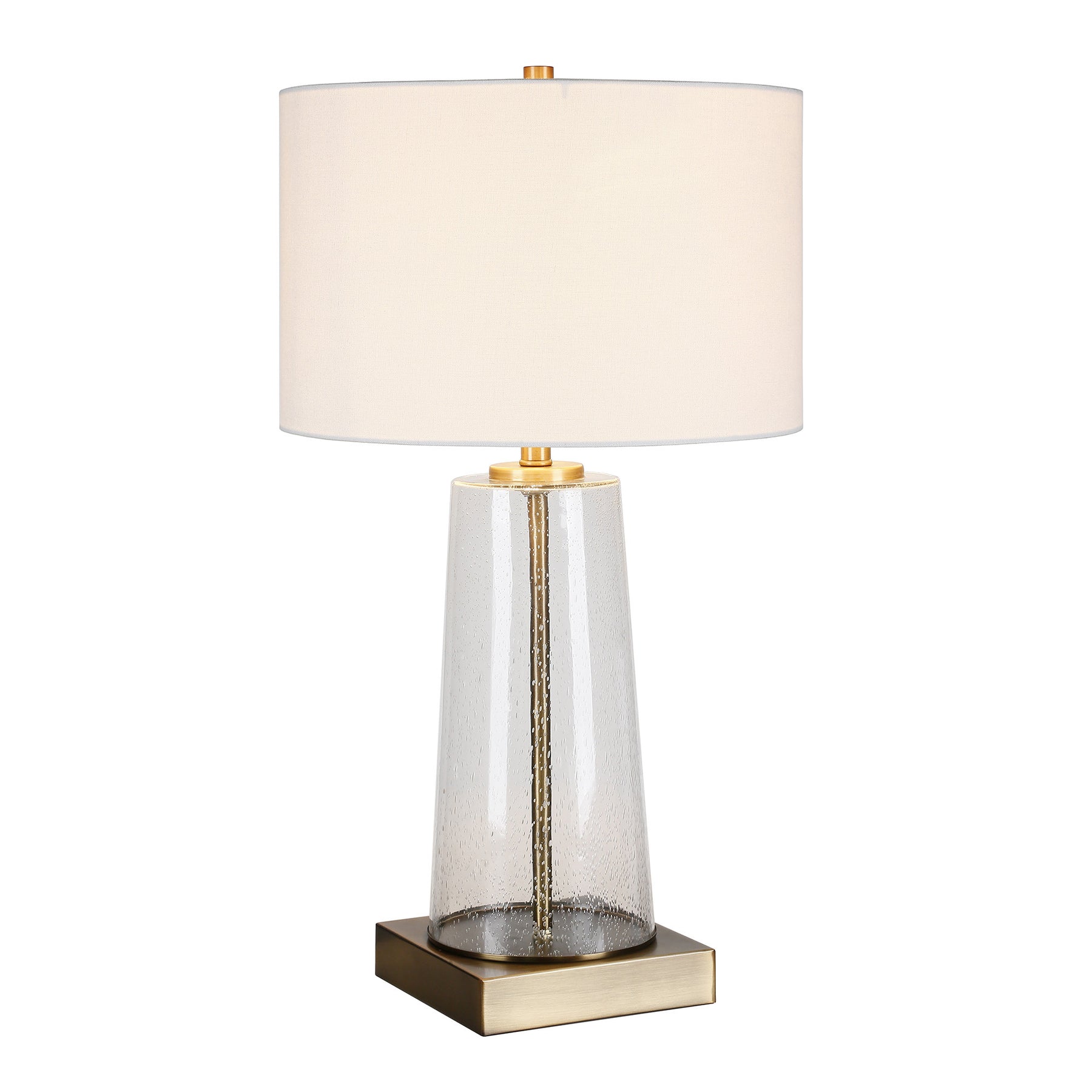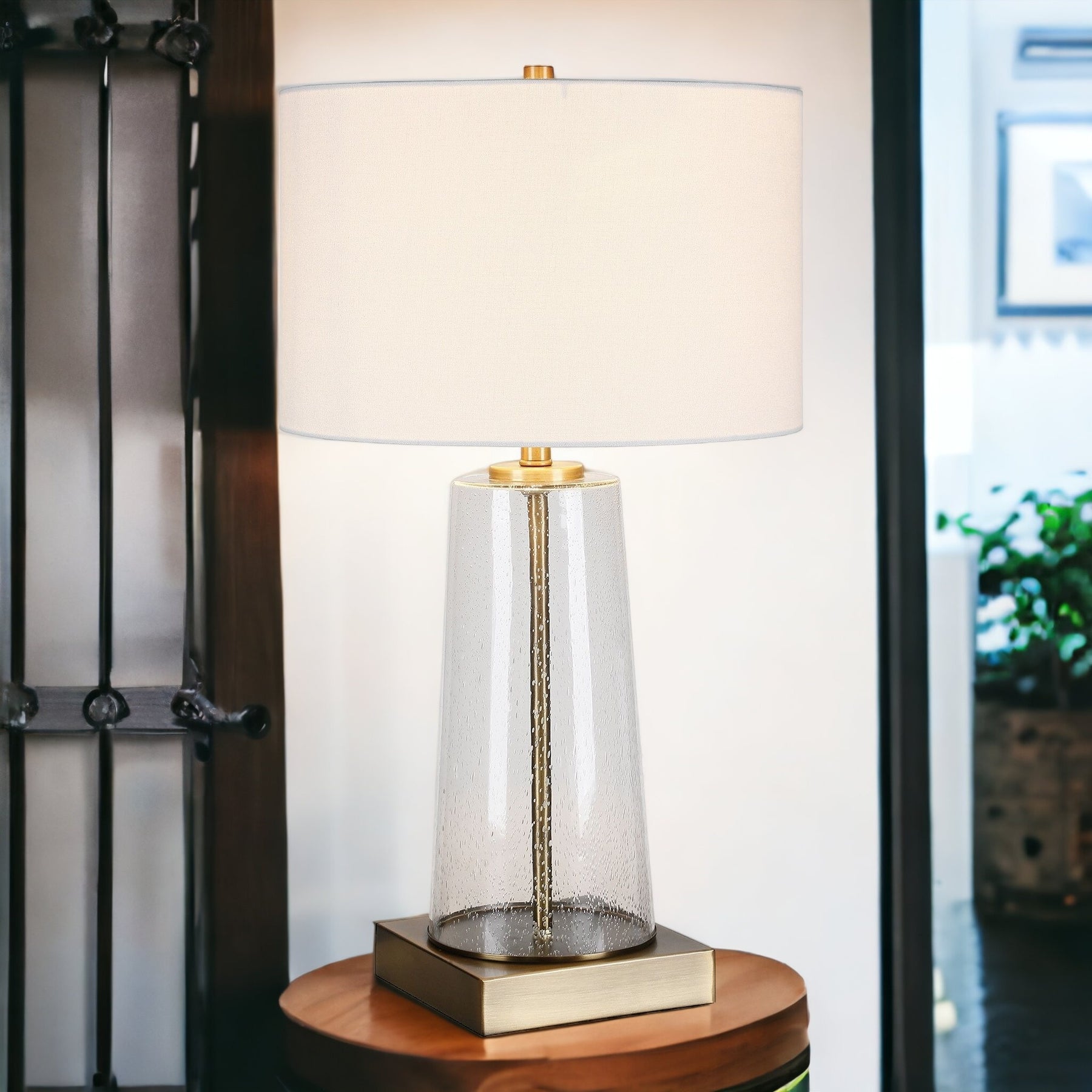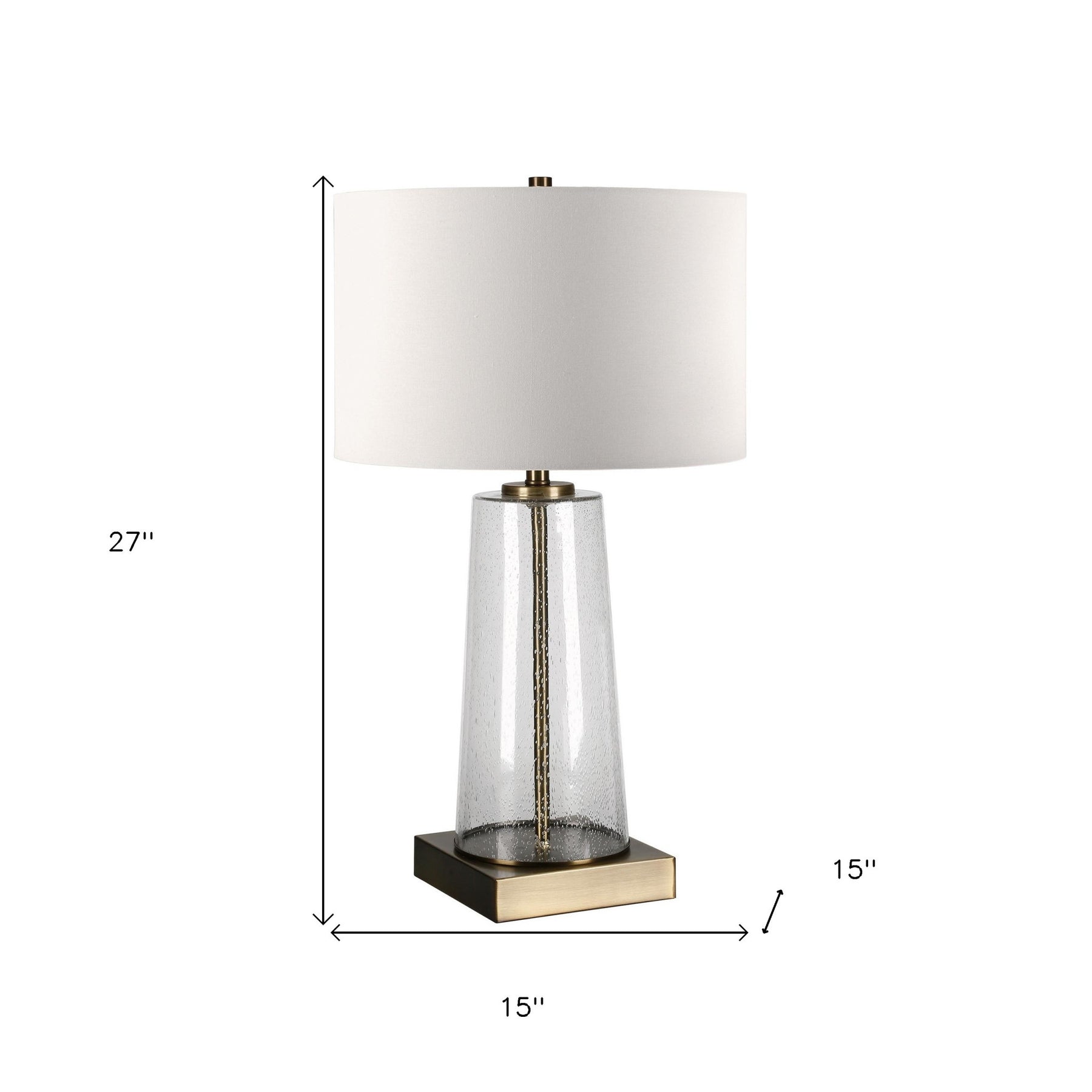 Embrace the good life with this hard working and stylish 27-inch brass glass table lamp with white drum shade. The base of this lamp is made of glass finished in a brass tone. Includes a white linen, drum shaped shade, making this a fashionable piece that will complement most any interior. This standard table lamp is designed to provide general lighting to the area. High quality design makes this a great lamp for not only lighting, but accenting a room with style. The perfect lamp to create just the right natural and soothing light in your space. 27-inch H x 15-inch W x 15-inch D