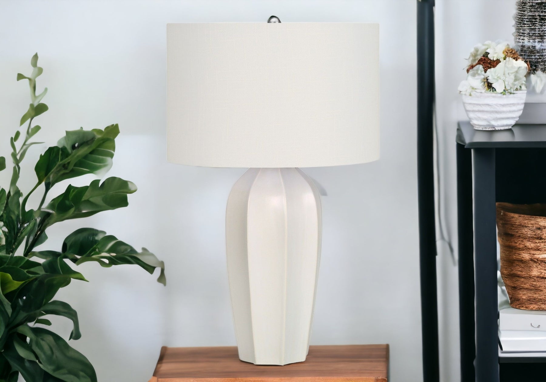 This 27-inch cream ceramic geometric table lamp with cream drum shade is the perfect combination of design and function. The base of this lamp is made of ceramic finished in a cream tone. The cream drum linen shade is a great compliment to this lamp. This standard table lamp is designed to provide general lighting to the area. Use this lamp anywhere and elevate the look of the whole space. It is perfect for virtually any decor. 27-inch H x 16.5-inch W x 16.5-inch D
