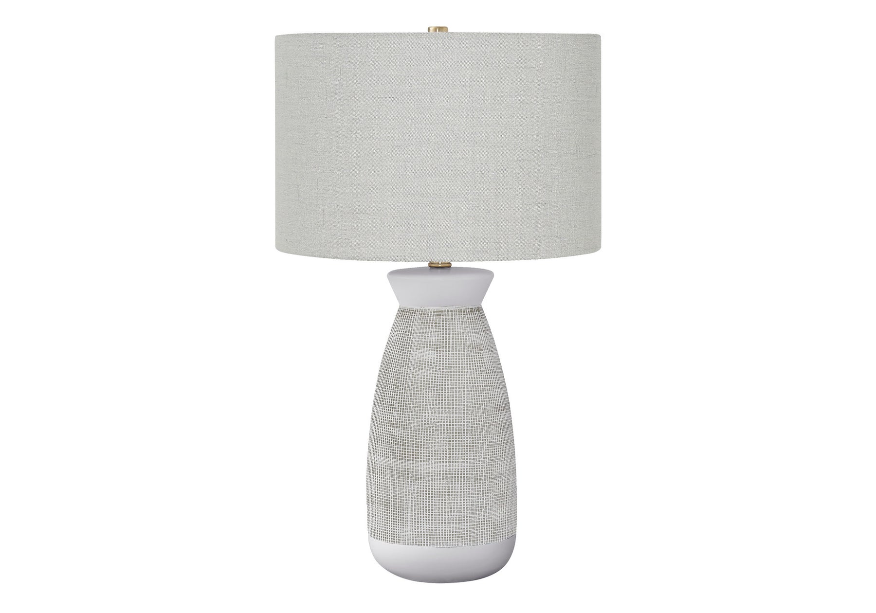 Truly a mix of design and functionality that doesn't compromise on style, this 27-inch gray and white ceramic round table lamp with gray drum shade will be a great addition to your space. A gorgeous gray and white textured ceramic base brings just the right amount of pizzazz to this fabulous lamp. The gray shade has a drum shape and is made of linen, which makes it a perfect choice. This standard table lamp is designed to provide general lighting to the area. Use this lamp anywhere and elevate the look of the whole space. Bring some lite and good vibes into your space with this updated and stylishly designed lamp. 26.5-inch H x 15.5-inch W x 15.5-inch D