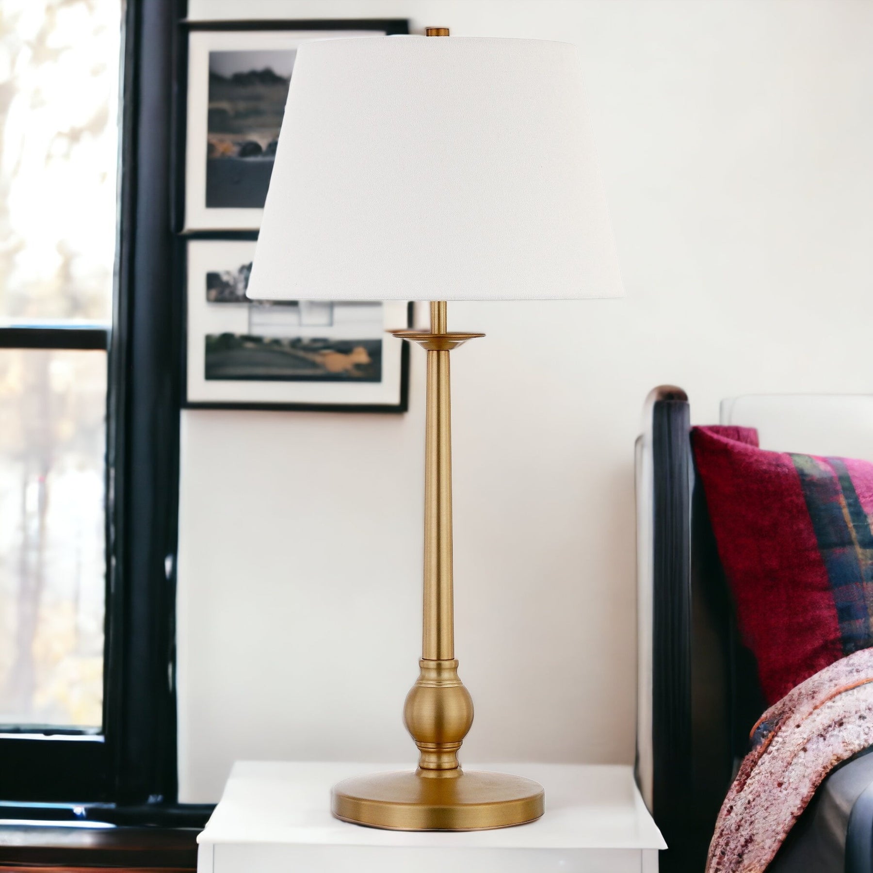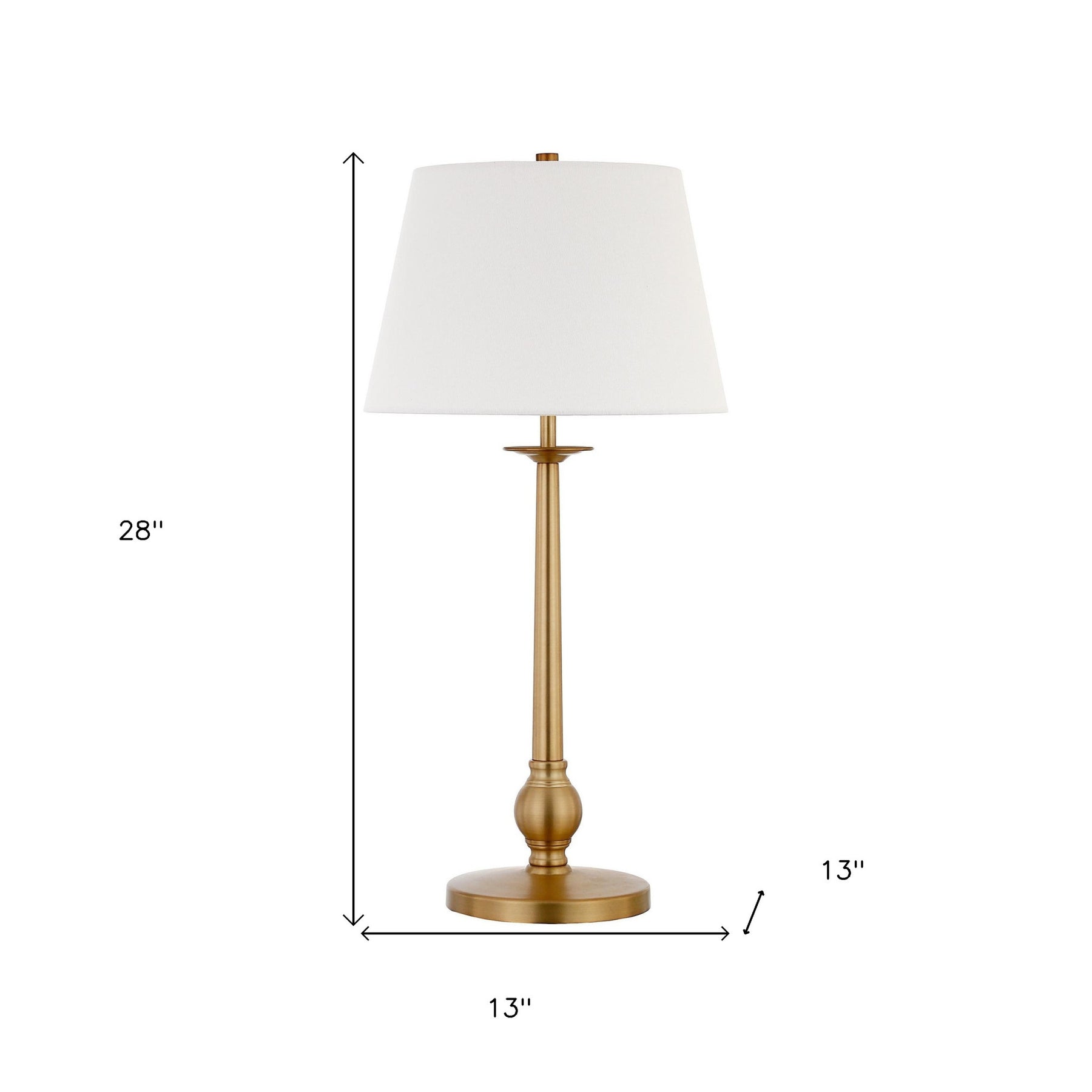 With this 28-inch brass metal table lamp with white empire shade you can bring in design to any space along with adding some ambient lighting. The base of this lamp is made of metal finished in a brass tone. The white empire fabric shade is a great compliment to this lamp. This standard table lamp is designed to provide general lighting to the area. Use this lamp anywhere and elevate the look of the whole space. The perfect lamp to create just the right natural and soothing light in your space. 28-inch H x 13-inch W x 13-inch D